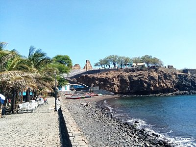 Za palácem prezidenta je vyhlídka na město. Vidíme nedostavěnou budovu, která měla být hotelem pro kasino. Mělo být na ostrůvku, ke kterému bohatý podnikatel z Macaa sice postavil most, ale nakonec odešel ze země, protože mu kapverdská vláda nepovolila založit si v Praia banku. Nikdo neví, co s nedokončeným projektem udělat. Na vyhlídce stojí i socha údajného objevitele Kapverd jménem Diogo Gomes. Byl to portugalský mořeplavec ve službách prince Jindřicha Mořeplavce. Dnes je ale za objevitele Kapverdských ostrovů považován spíše Janovan Antonio de Noli. Procházka centrem Praia pokračuje kolem kasáren, ulicí s mnoha klinikami a nemocnicemi a přes pěší zónu zpět k autu. Končíme na pobřeží moře, kde se nacházejí dvě nepříliš vábně vypadající městské pláže. Lidé se tam však koupou. Teplota vody je 23 stupňů. Autem najedeme k bílému majáku, který je dominantou pobřeží. V parku nad plážemi stojí socha papeže Jana Pavla II. Cestou do naší čtvrti vidíme skupinku mužů popíjejících „grog“. Takto se zde nazývá podomácku pálená kořalka vyráběná z cukrové třtiny. Den končíme v naší churrasqueira, kde jsme si už dopoledne objednali tradiční jídlo „massa de milho con carne de vaca“ čili jakýsi kukuřičný kuskus s hovězím masem. Jako vždy je jídlo doplněno fazolemi, sladkými batáty, maniokem a vařenou zeleninou.
