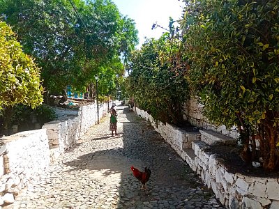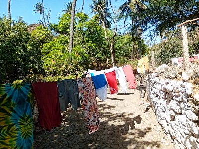 Naopak pranýř z bílého mramoru v centru městečka, který byl symbolem přísné moci otrokářů, přežil dodnes. Prošli jsme se v malém přístavu kolem restaurací s výhledem na moře. Poté jsme zašli do starobylé uličky Rua Banana. Záhy jsme byli osloveni místním mladíkem. Obvykle to neděláme, ale po rozpačitém úvodu jsme souhlasili s jeho doprovodem. A vyplatilo se nám to. Kamenné domky v této uličce mají nosnou konstrukci střechy vyrobenou ze stvolů cukrové třtiny, které jsou vypleteny listy kokosové palmy. Taková střecha vydrží tři roky. Vzhledem ke statutu UNESCO tohoto městečka je rekonstrukce střechy hrazena státem. Náš průvodce nám ukázal svůj domek a pozval nás dovnitř. Bydlí tam celkem deset členů jeho širší rodiny. Neustlané postele v ložnici, malá kuchyňka. Pohodlný obývací pokoj byl ovšem vybaven velmi moderně. Domek je průchozí, na druhé straně je východ do ulice Carreira. Na chodbě se k nám připojil milý pejsek, vlastně fenka, měla už dvakrát štěňata. Zůstala s námi až do konce procházky. Na konci ulice Banana vedla úzká stezka k ruinám kláštera São Francisco. Vypadala dost nebezpečně, takže jsme došli pouze ke břehu vyschlé řeky. Kdysi do ní vplouvaly lodě, dnes je v říčním korytu voda pouze v období dešťů, které se ale už čtyři roky nekonalo.