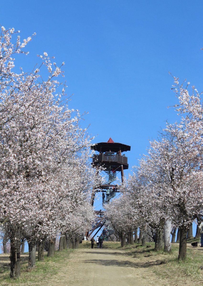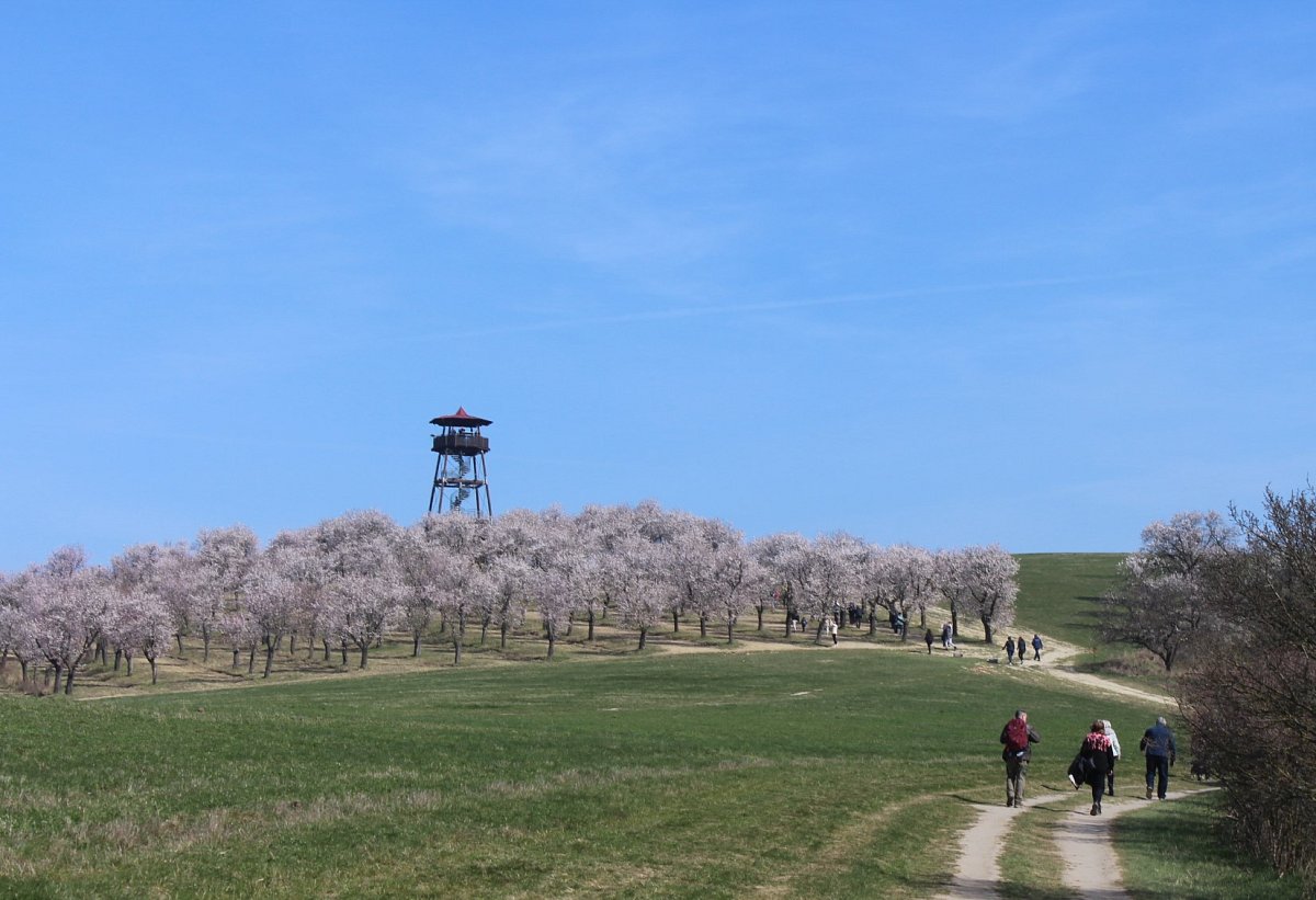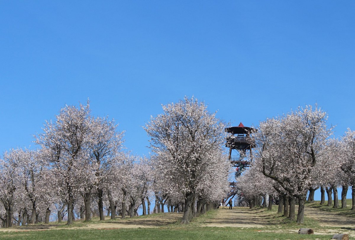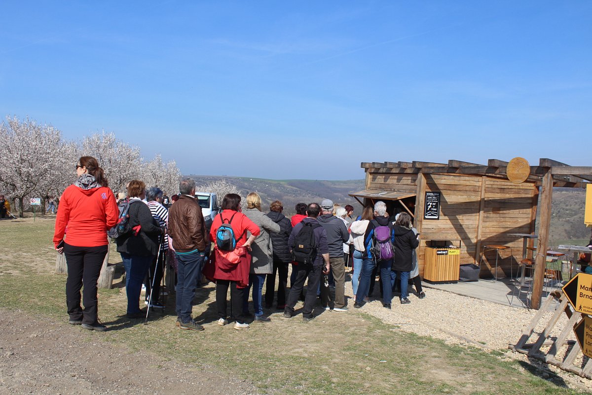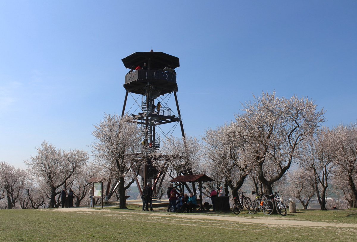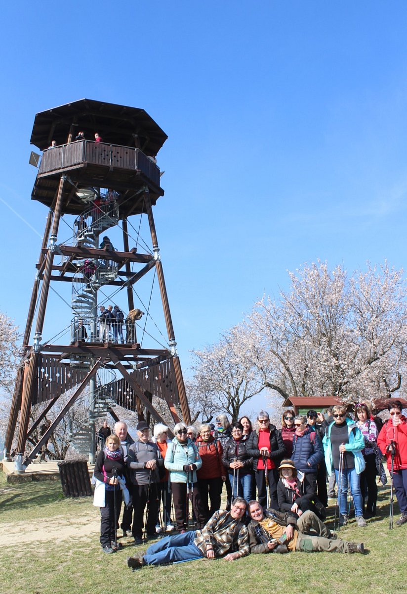 K dopravě jsme využili rychlík Olomouc-Brno, který nás přepravil do stanice Šakvice, a odtud jsme jeli malým osobákem do Hustopečí. Prošli jsme si náměstí s hezkou radnicí, a vydali jsme se na rozhlednu Starý vrch nad městem. Z rozhledny jsme viděli velké plochy nových i starých mandloňových sadů, které jsou unikátem nejen v České replublice, ale i v celé střední Evropě. V době největšího rozmachu v nich rostlo 50 tisíc mandloní.