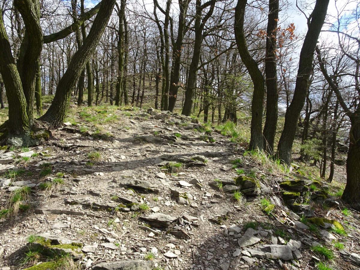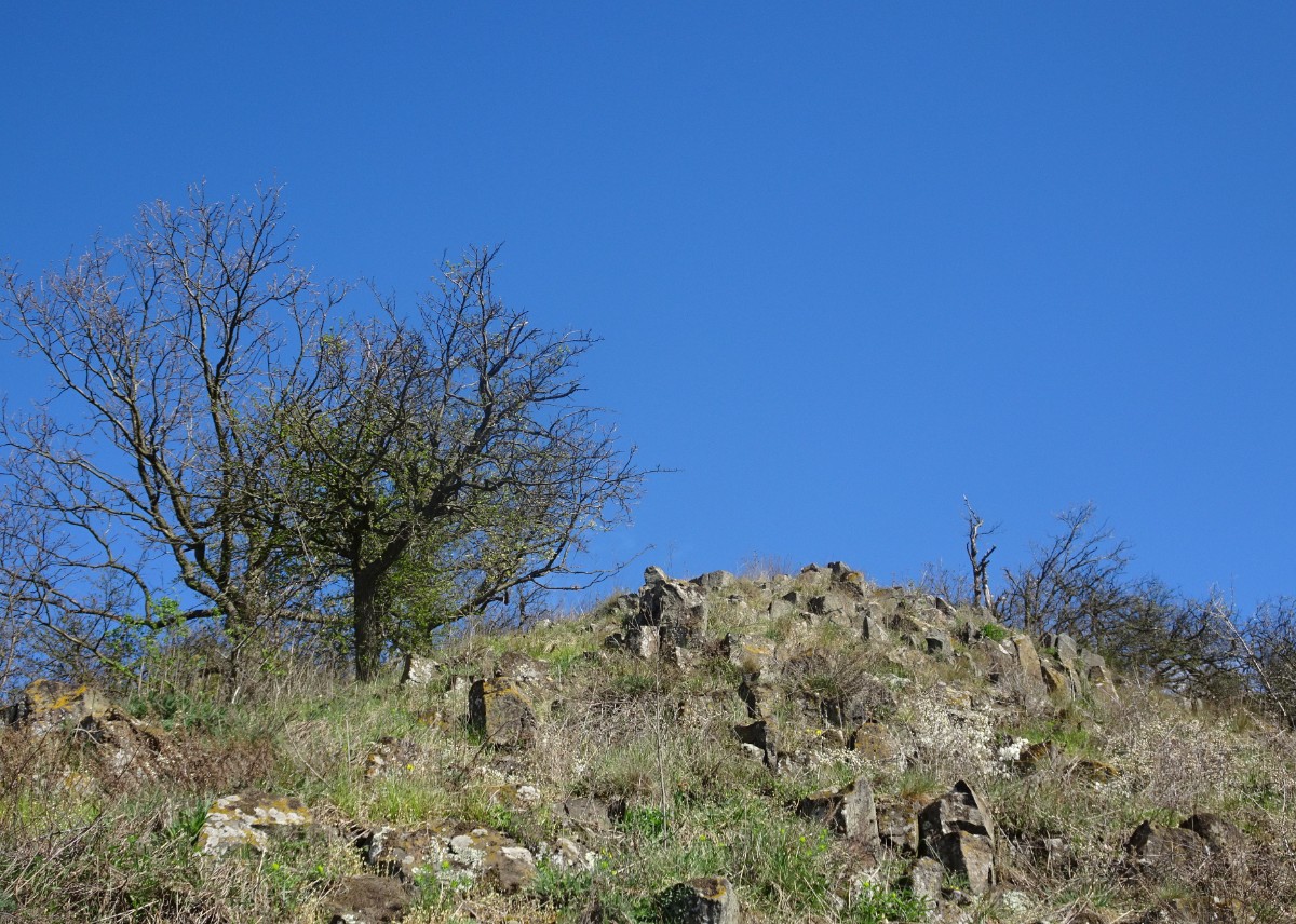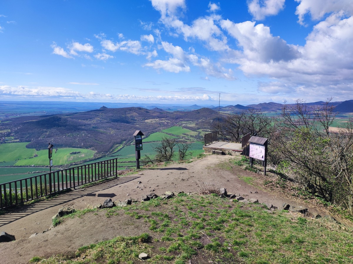 Dopolední počasí bylo jako vymalované. Cesta kouzelným jarním lesem, lemovaná fialkami, petrklíči, podléškami a hlavně sasankami, jichž je plný les, zvolna, ale vytrvale stoupá. V korunách vyzpěvují ptáčci své jarní písně touhy a ani se nenadějeme, les se otevře a před očima máme panorama, na které jsme se tak těšili. Vítr fičí a kapuce větrovky přijde vhod. Ještě kousek, cesta se obtáčí kolem skalnatého vrcholu, pár schodů a jsme na terase u turistické chaty. Ta je v tomto ročním období otevřená od pátečního odpoledne do nedělního podvečera. Cesta je pohodová a byla jsem nahoře, ani jsem se nezadýchala. Na Lovoš jsem si vyšlápla těsně po velikonocích a ani cestou ani nahoře jsem se prakticky s nikým nepotkala. Všichni už tu byli o svátcích … Nahoře na vyhlídkové terase jsou lavičky, bohužel však zrovna výhled na Milešovku a kopečky kolem ní je narušený vzrostlými stromy.