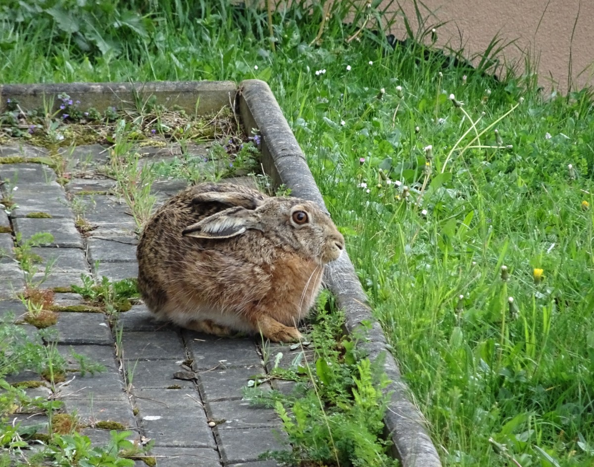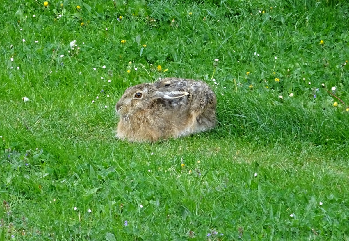 Vracela jsem se domů kolem kostela a přes park a na sídlišti u paneláků seděli dva zajíci. Není to pro mě žádná novinka, zajíci žijí na polích za městem a na trávnících mezi domy se pasou docela často. Psi na vodítkách je vůbec nevzrušují a ani jsem neviděla, že by nějaký sídlištní hafík měl snahu se za zajícem rozběhnout. Foťák jsem měla v kapse a udělala jsem si malý zaječí fotolov.  Zkrátka seniorský den jako malovaný.