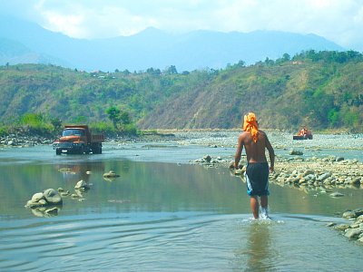 Další úsek cesty vede do konečného cíle první části našeho pobytu na Filipínách, kterým je španělské koloniální město Vigan, zapsané na seznam světového dědictví UNESCO. Na trase budeme muset překonat překážku v podobě řeky Lagben, kde v době našeho putování nebyl most. Zdálo se, že probíhá jeho stavba, my jsme ovšem nemohli čekat, až ho dostaví, a museli jsme tudíž řekou projet. Naštěstí v ní bylo málo vody a nechyběli ochotní „převaděči“. Za malý peníz nás jeden z nich převedl mělkou vodou na druhý břeh.
