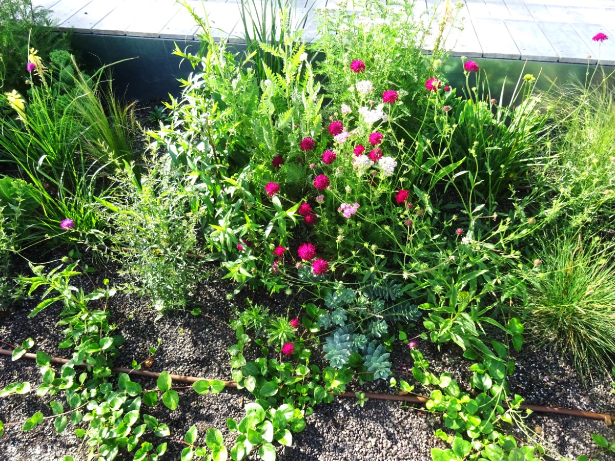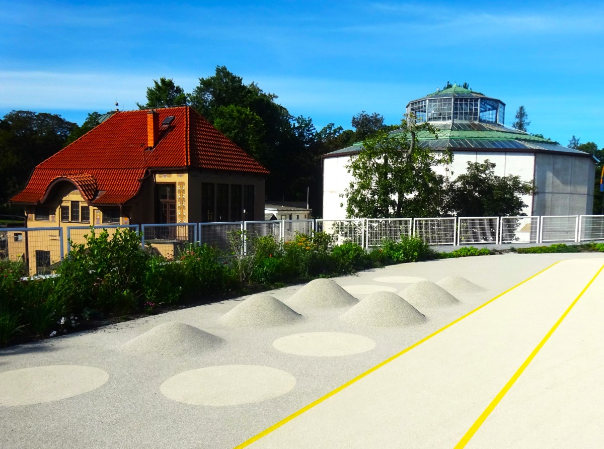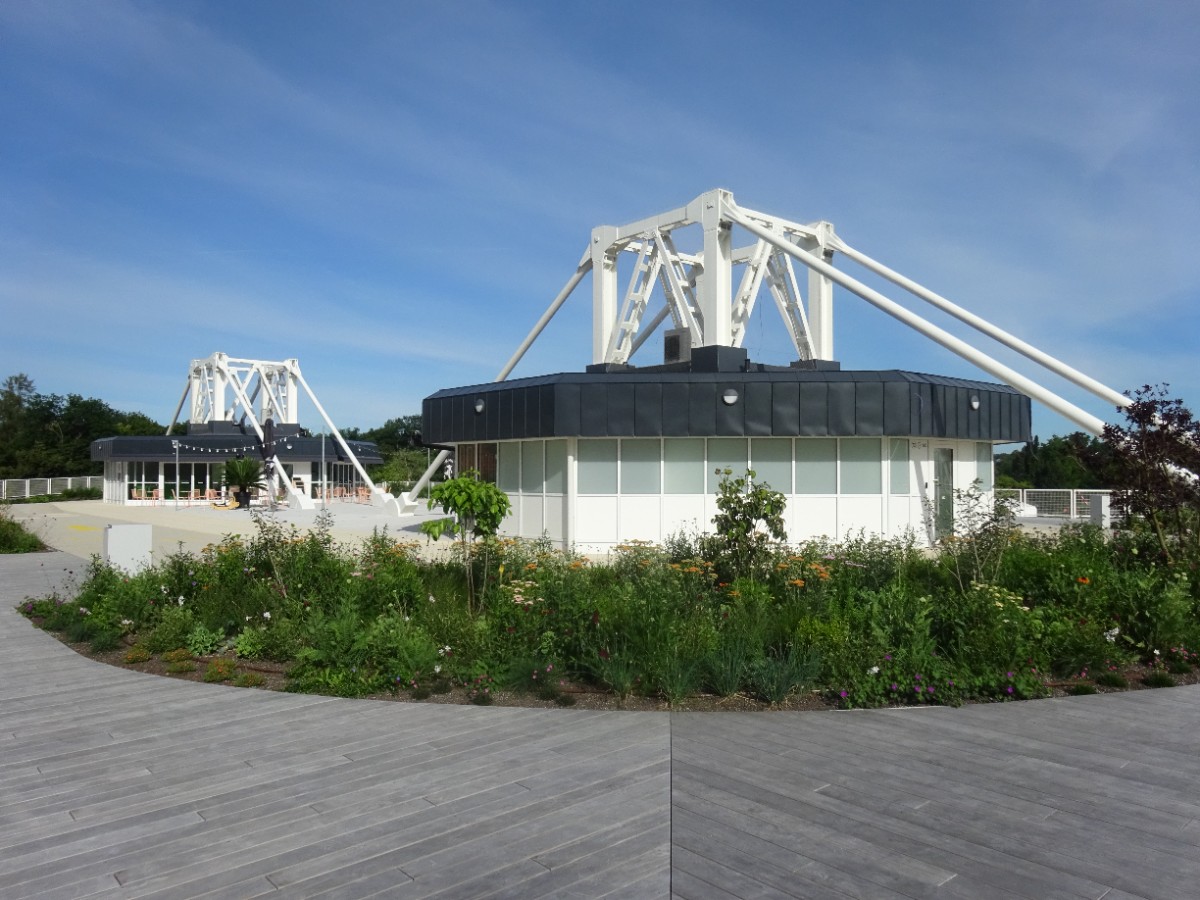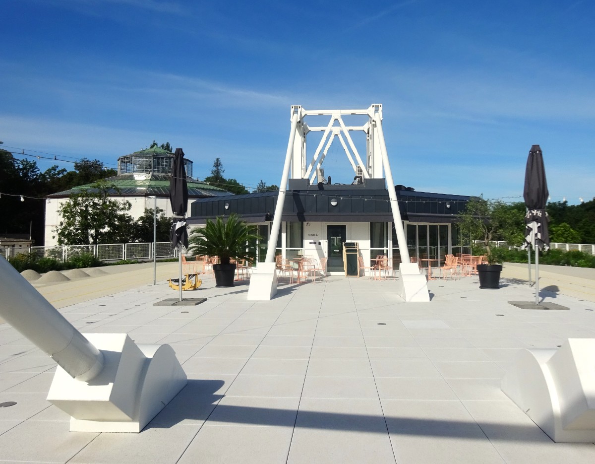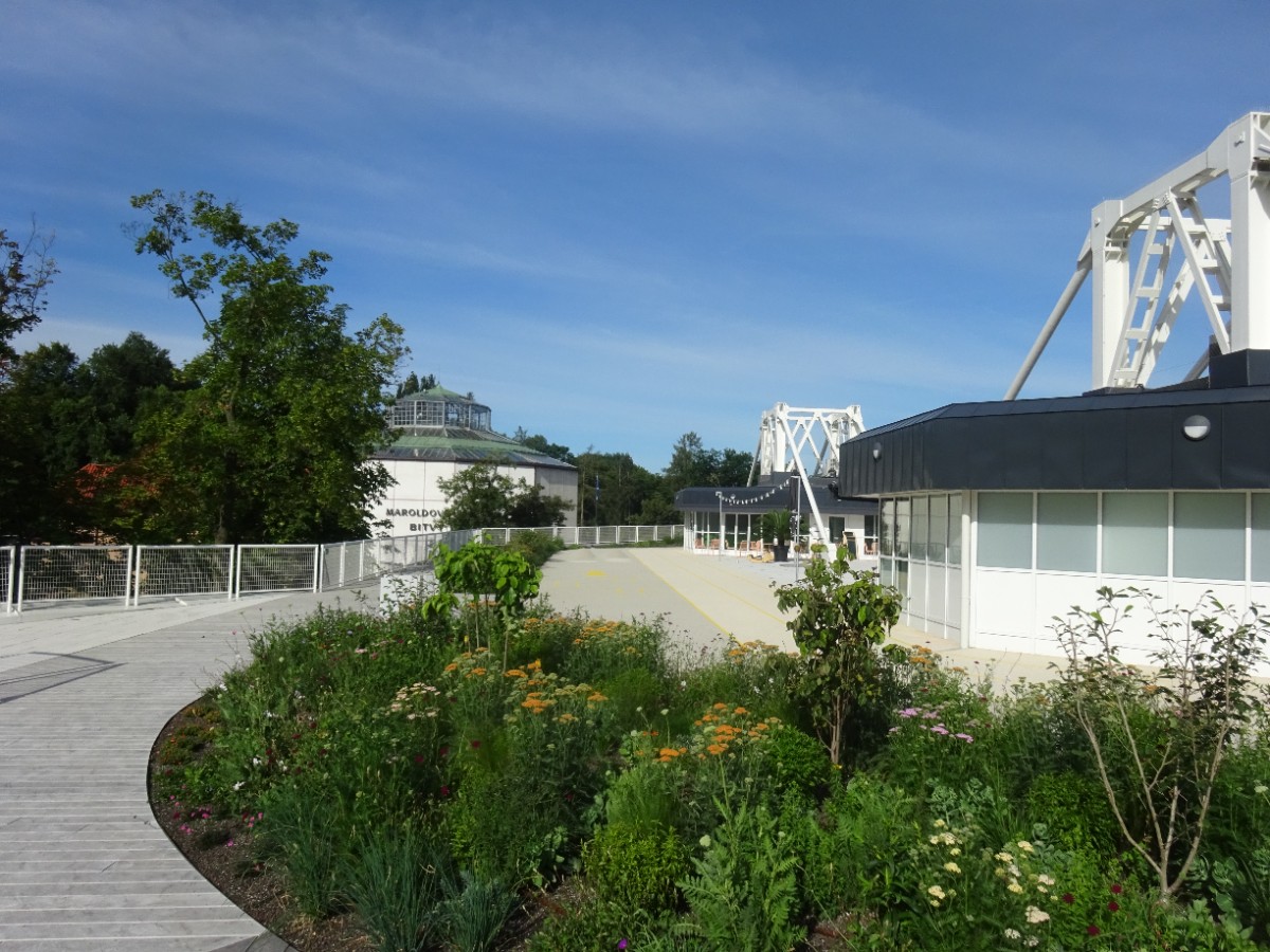 Na střechách pavilonů C a D jsou kulturní traviny a tribunky s výhledem na Křižíkovu fontánu a do Stromovky. Na pavilonech E a B jsou bufety obklopené záhony s trvalkami, nechybí ani kruhové zákoutí s lavičkami k odpočinku. K příjemnému prostředí přispívají mlžítka. Malé návštěvníky s rodiči jistě potěší herní prvky pro děti.