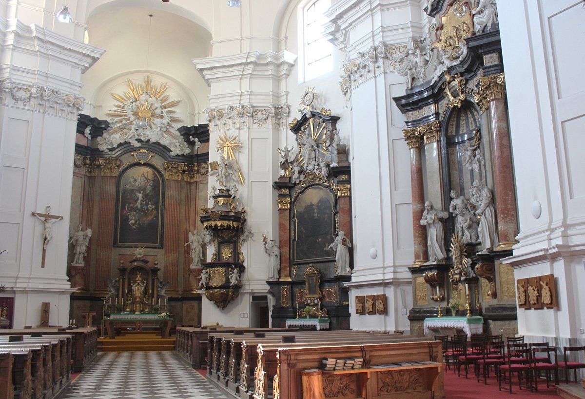 Cesta k přístavu vedla kolem velkého kostela s bývalým klášterem, který byl otevřený. Nikde nebylo ani živáčka, nkdo nás nerušil v naší prohlídce. Prohlédli jsme si kostel i dlouhé chodby kláštera. Po pár metrech jsme přišli k dalšímu menšímu kostelu sv. Bartoloměje na náměstí, které nese jeho jméno. Obyvatel města jsme moc nepotkali. Zato u přístavu za náměstím bylo živo. V přilehlém parku seděli někteří u vychlazených nápojů nebo u kafíčka. Děti dováděly v lanovém centru, a u naší lodě jsme uviděli řadu dalších zájemců o plavbu. Rychle jsme  se zařadili a chytili tak dvě poslední místa na spodní palubě. Začínalo se oteplovat, a prožít dvě hodiny na slunečním žáru jsme v plánu neměli.