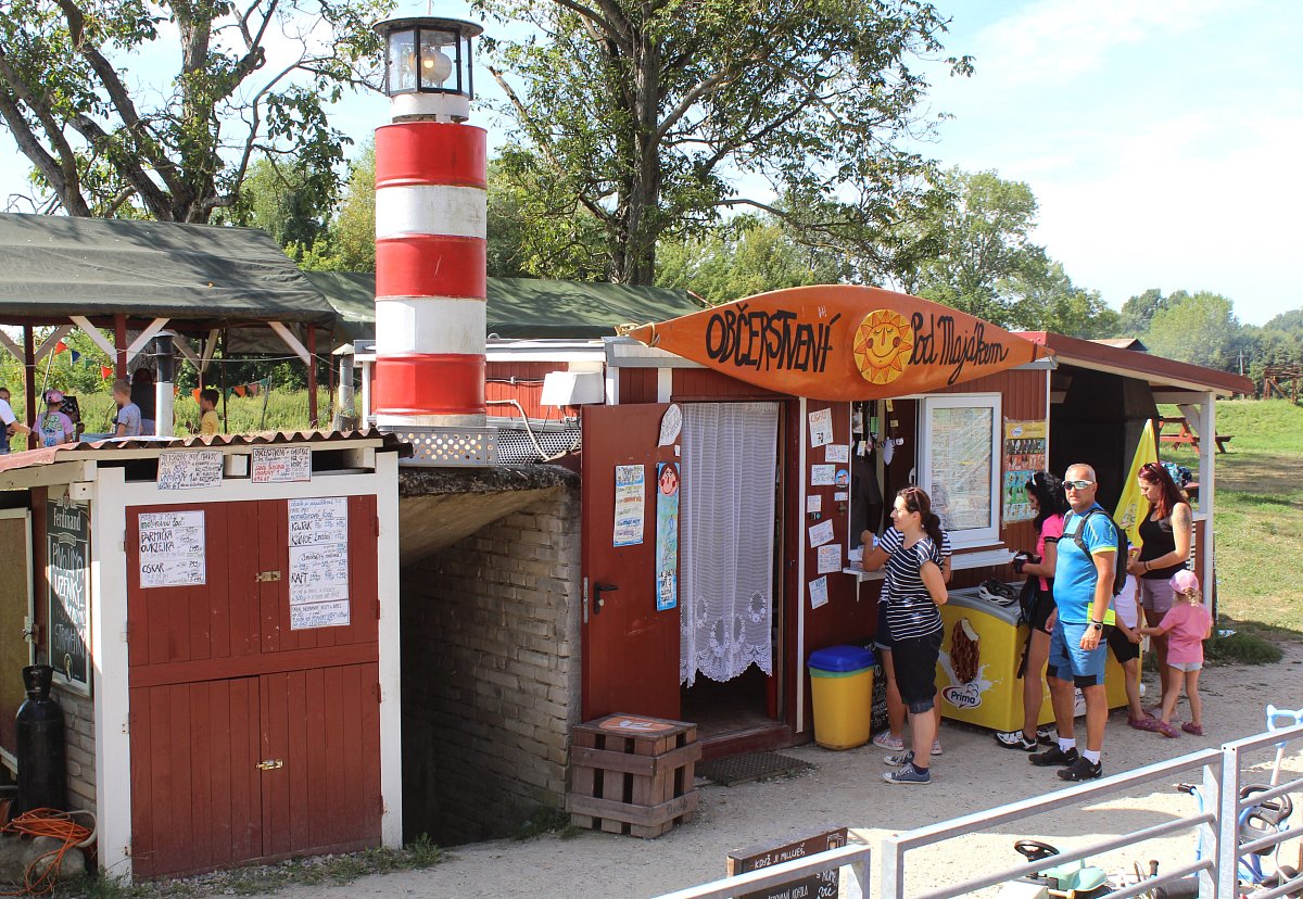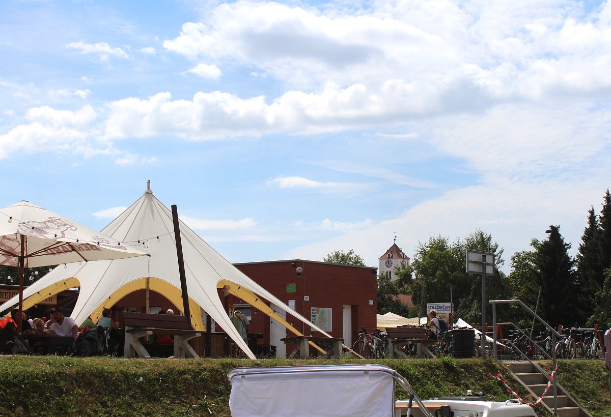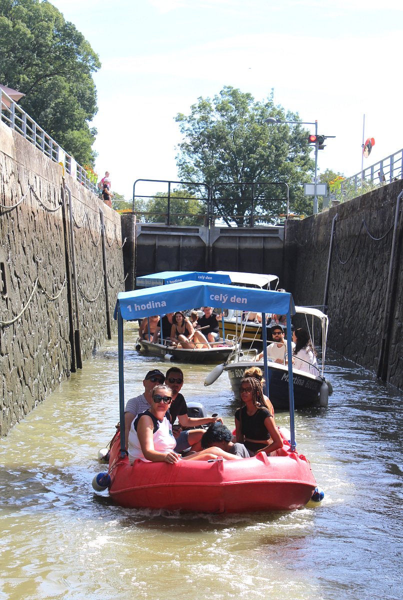 Podél kanálu vede cyklostezka, po které se proháněli cyklisté všech generací, a na vodě se to hemžilo malými plavidly s veselými posádkami. Minuli jsme kostel ve Vnorovech a zajímavý skautský tábor. Potom už se přiblížila plavební komora, do které nás spolu s ostatními loděmi zavřeli, aby mohli vyrovnat hladinu vody. Přežili jsme to ve zdraví, a beze ztrát jsme dopluli až do Strážnice, když právě na kostele odbíjeli poledne.