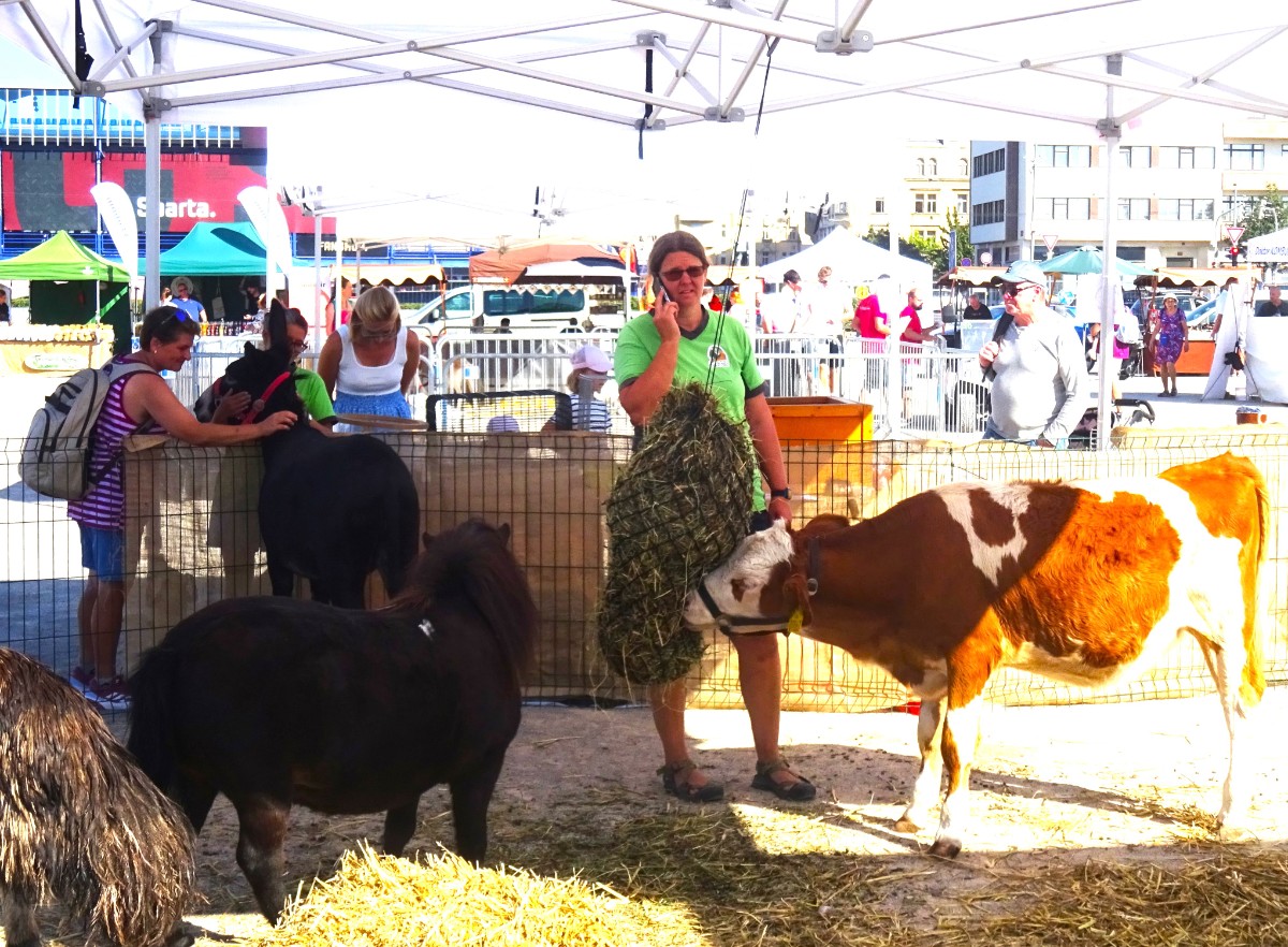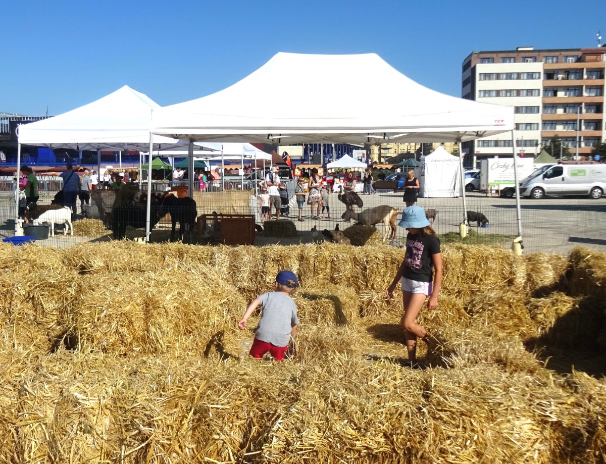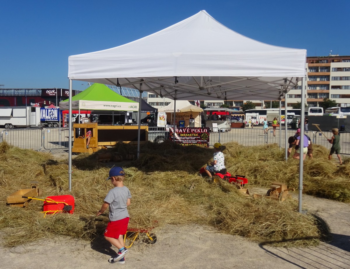 U vstupu do areálu hrála cimbálovka. Na Letenské pláni mě jako první zaujal prostor vyhrazený dětem, kde si mohly vyzkoušet některé zemědělské práce – jezdit s traktůrkem, shrabovat a nakládat seno aj.