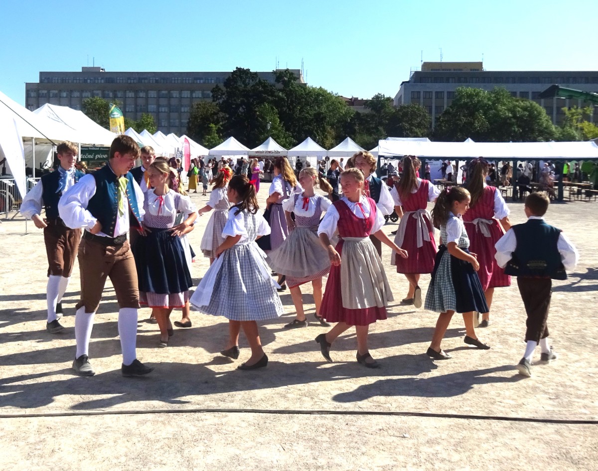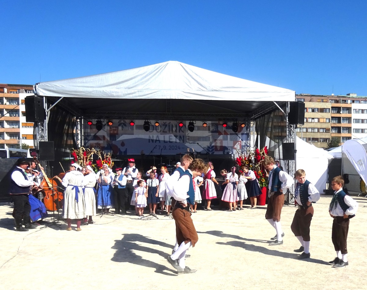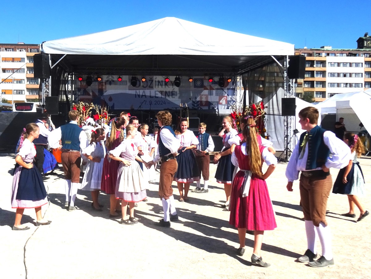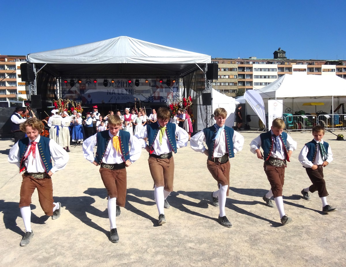 Na prostranství pod pódiem předváděli chlapci a dívky pěkné folklorní tance.