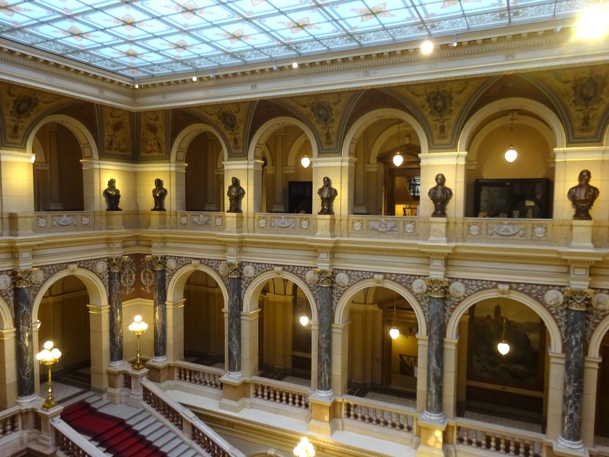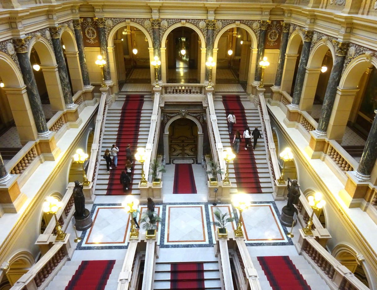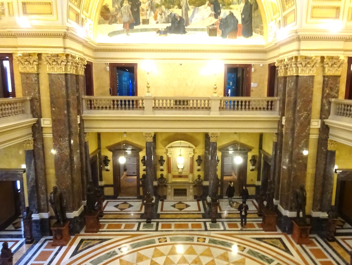 Nejdůležitějšími prostorami v interiéru budovy jsou vstupní vestibul, na něj navazující monumentální dvorana hlavního schodiště, osvětlená proskleným stropem, a především Panteon umístěný pod kopulí.