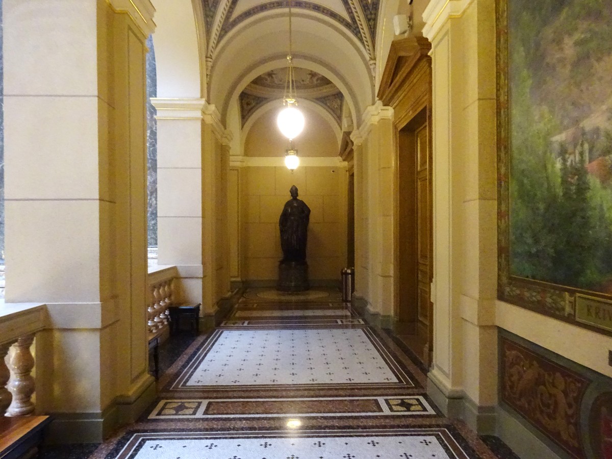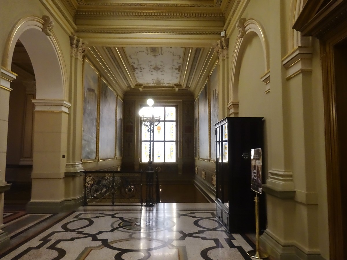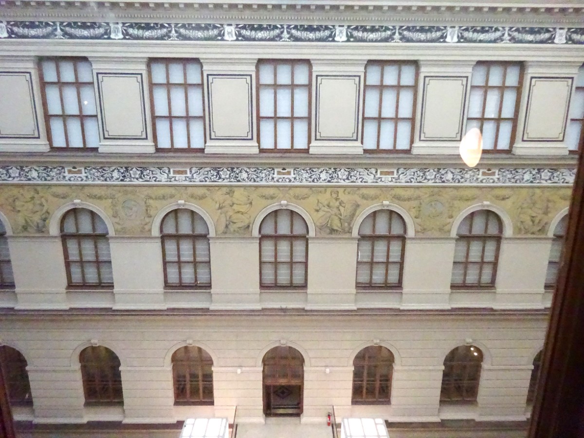 Nejdůležitějšími prostorami v interiéru budovy jsou vstupní vestibul, na něj navazující monumentální dvorana hlavního schodiště, osvětlená proskleným stropem, a především Panteon umístěný pod kopulí.