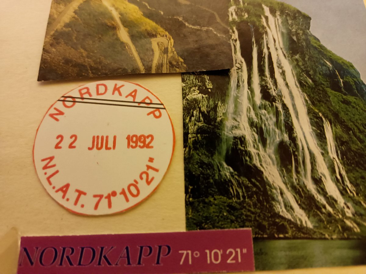 Dramatickou cestou tunely a mosty přes fjordy, zatáčkami kolem skal nad srázy do moře. Leje a jsme u trajektu. Cesta trvá 3/4 hodiny. Řidič je kontrolován, zda nepožil alkohol a můžeme pokračovat. Je mlha, obrovské srázy kolem, divoká krajina, jedeme pomaleji, blíží se půlnoc čtvrtek 23.7. 1992. Venku je psí počasí, vichr, déšť a zima. Stojíme na parkovišti pod Severním mysem. Dobýváme Nordkap v pláštěnkách. Na skalách se čerti žení a Barentsovo moře jen tušíme. Fotky u globu, který je položenna úrovni středního Grónska. V Luxusním areálu ještě turistické razítko a uchylujeme se do autobusu.