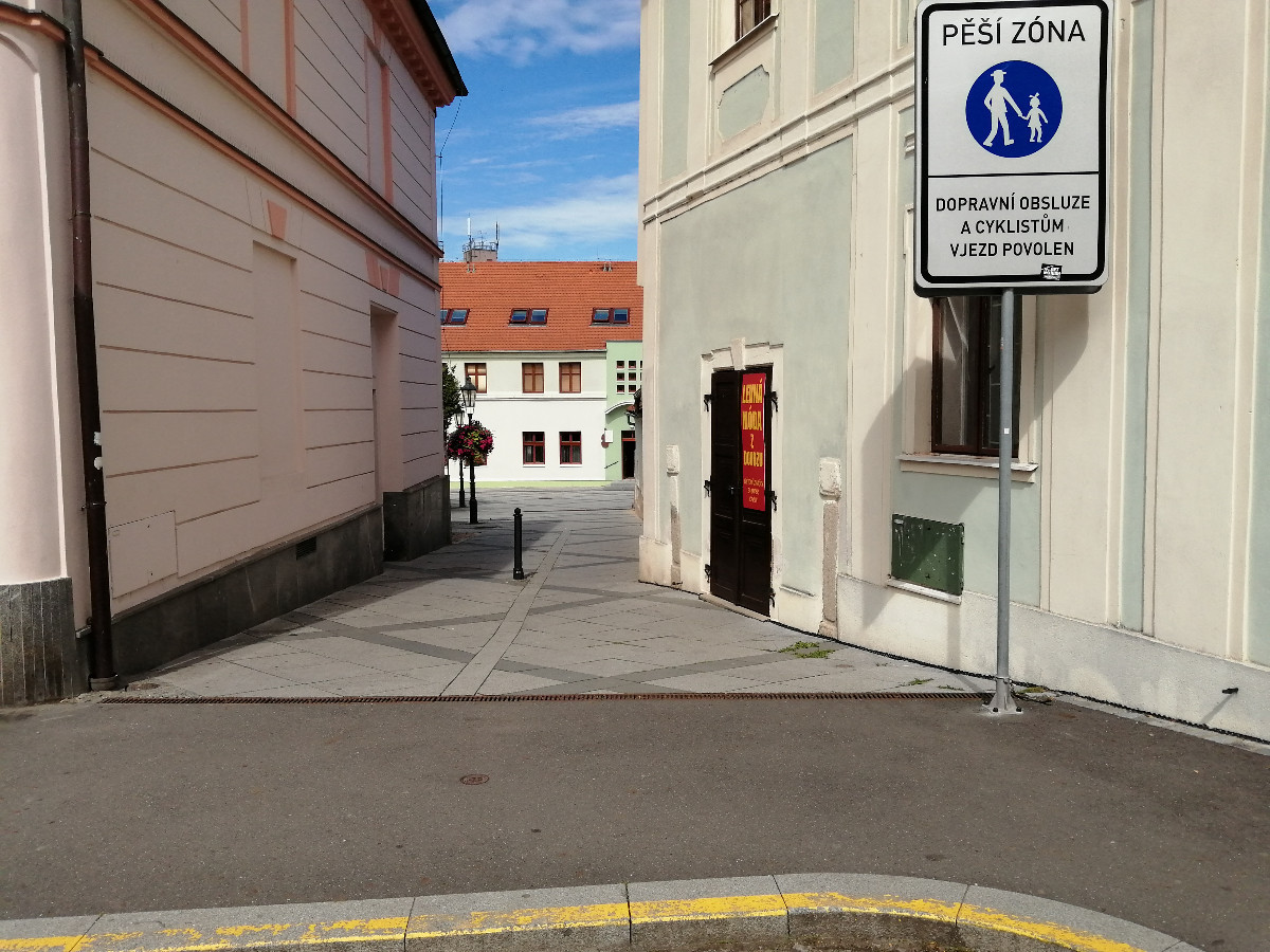 /5/ Značka je správná, ale co když je dopravní obsluhou auto? Tak kudy? (Nejsem si jistý, zda jsem tohle fotil v Tachově u náměstí.)