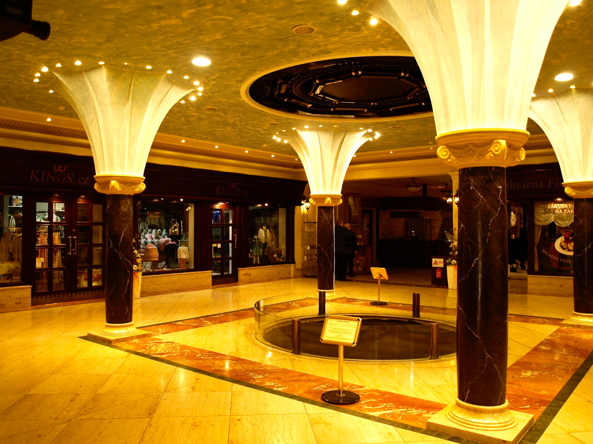 Historizujícím průčelím z Růžové ulice vstoupíte do pasáže, která je průchozí směrem k zimnímu stadionu. Vpravo vás přivítá socha sv. Floriána s pokladničkami charitativních sbírek. Dominantou výjimečného interiéru pasáže je však unikátní vodní fontána s nepřekonatelnou aqua show, která zde byla nainstalována jako teprve druhá svého druhu v Evropě.