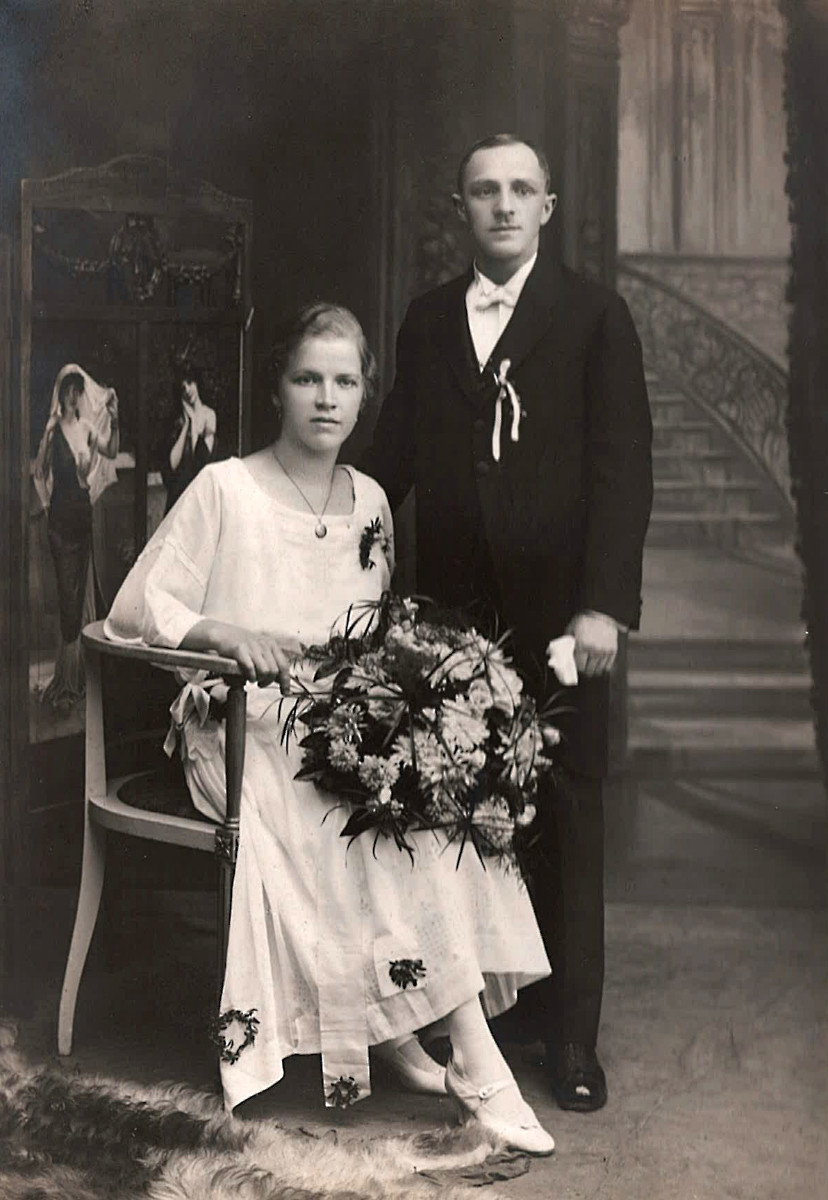 Svatební fotografie Marie Benešové a mého otce. A skupina účastníků telegrafní školy v Celji ve Slovinsku. (Obě fotografie z osobního archivu Oldřicha Čepelky)