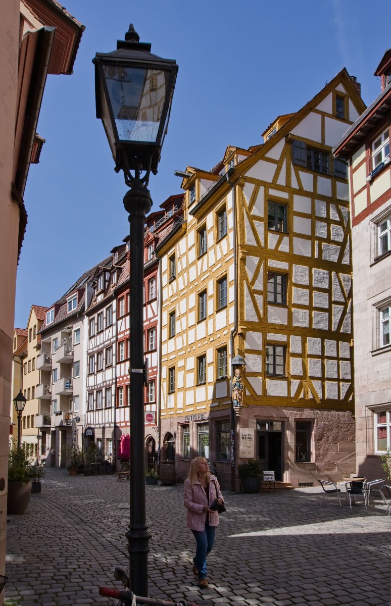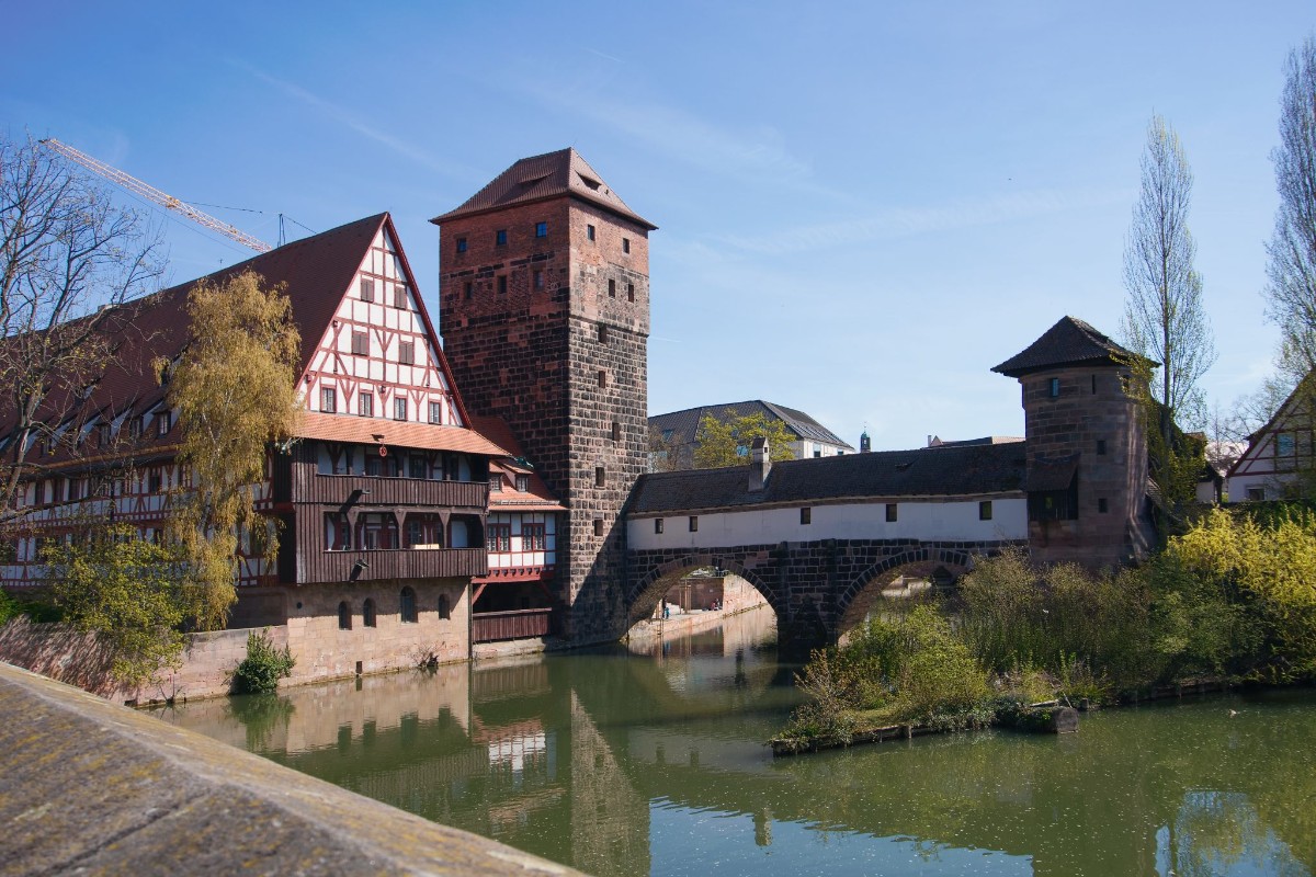 Norimberkem protéká řeka Pegnitz a vytvořila tu několik ostrovů. Vede přes ni řada mostů. Průvodkyně nás zavedla na most Maxbrücke, odkud jsme obdivovali a hojně fotografovali pro město ikonickou skupinu staveb, zrcadlící se na hladině. Vodárenskou věž (Wasserturm) spojuje s menší Katovskou věží (Henkerturm), stojící na špici ostrova Trödelmarkt, pískovcový most s dřevěným krytem - Henkerbrücke. V přilehlém domku, kde sídlívali popravčí, se dnes nachází Muzeum kriminální minulosti Norimberku. Na druhý břeh vede celodřevěný krytý most, po němž bývali odváděni vězni na popraviště. Velký hrázděný dům vedle vodárenské věže je bývalý sklad vína (Weinstubel), dnes je v něm studentská kolej.