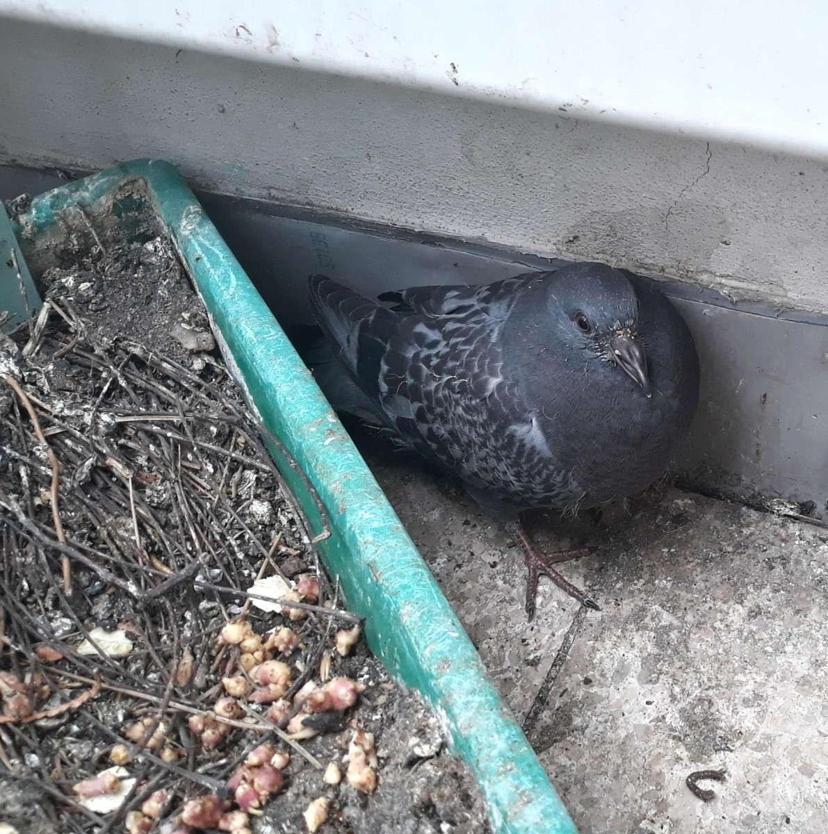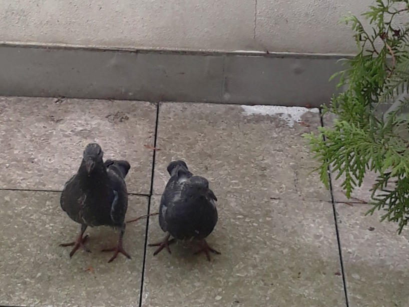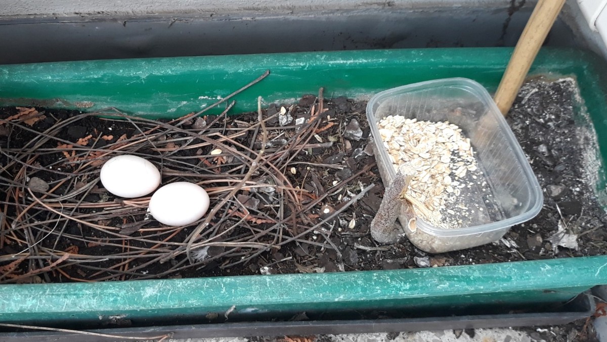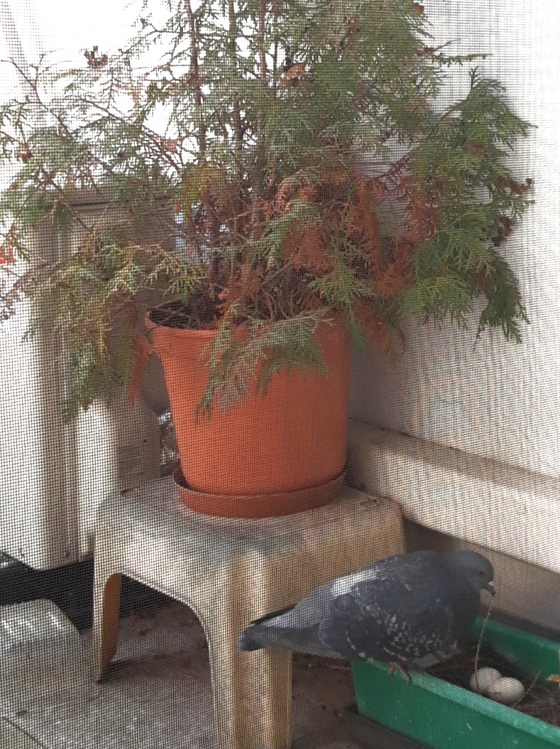 Pozoroval jsem, že na terasu, která byla stále v zimní verzi, nalétává párek holubů. A 6.3.2025 jsem uviděl v koutku za dveřmi na terasu v odstaveném truhlíku, kde se vždy uchytily maximálně náletové rostliny, že se tam usadila holubice. A seděla a seděla a holub jí tam přinášel v zobáčku tenké proutky a společně stavěli hnízdo. A najednou po šesti dnech, tj. 11.3.2025, vidím, že v hnízdě jsou dvě vajíčka (viz obr. 1 za článkem). První myšlenka byla vyhodit je. Ale probudil se ve mně dávný cit přírodovědce (již na střední škole jsem měl přírodovědnou specializaci a na Karlově universitě jsem vystudoval Přírodovědeckou fakultu, i když to byla fyzikální chemie), a tak jsem se rozhodl pozorovat, co se bude dít dále. Našel jsem si stránky, jak dlouho holub sedí na vejcích a jak dlouho trvá, než holoubata opustí hnízdo a odletí (viz první odkaz za článkem). Ten maximálně měsíc a kousek jsem se rozhodl pozorování věnovat. Zvláště když stůl v bytě, u něhož snídám, obědvám a večeřím, má výhled rovnou na terasu.
