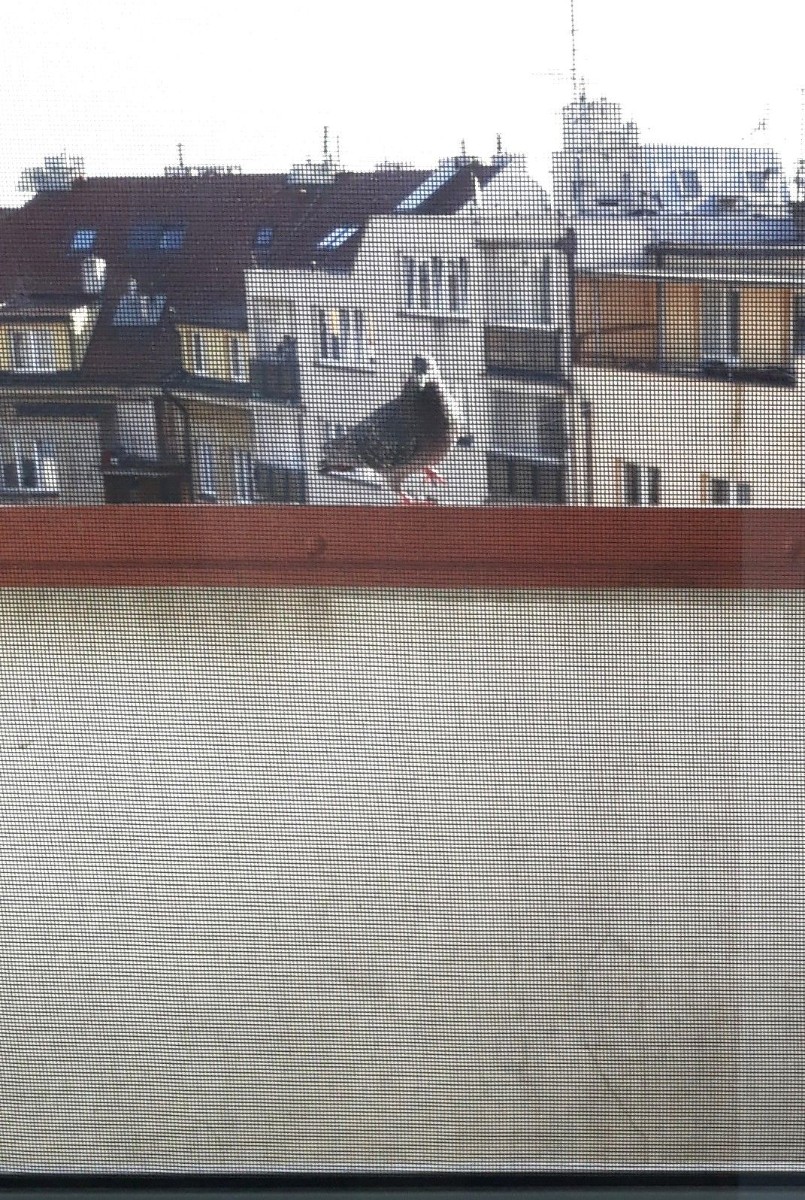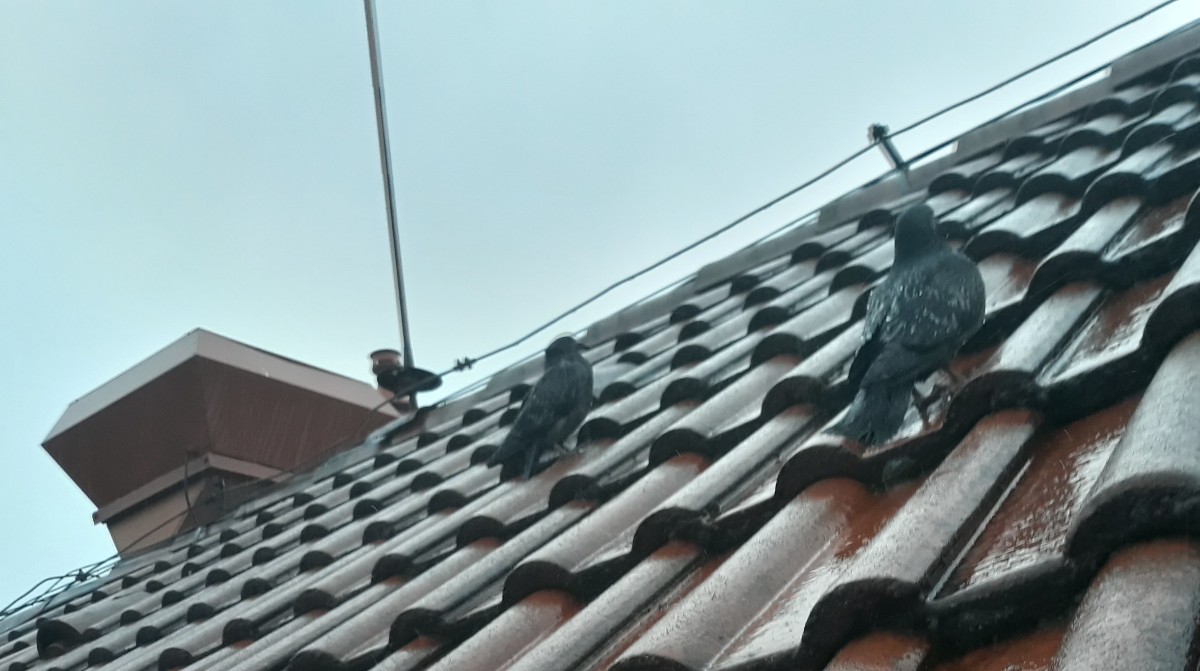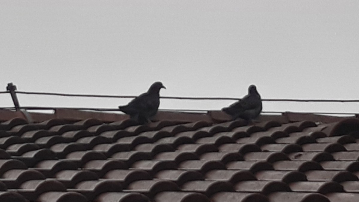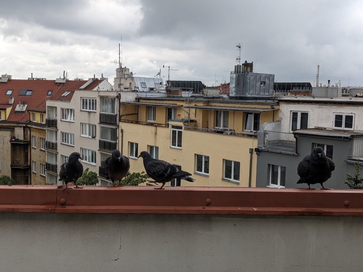 Ráno 24.4.2025 jsem se probudil a jako obvykle jsem se šel podívat, co je nového s holoubaty. A uviděl jsem, že v 6:40 už sedí na parapetu obě holoubata, takže vzlétlo po 30 dnech od vylíhnutí už i to menší holoubě (holubička). Přestože dost pršelo, společně obě holoubata zvědavě zkoumala okolní střechy (obr. 37 až 41). A to už v pravidelném čase přiletěl holub rodič na terasu krmit a holoubata nikde (obr. 42)! Tak jsem na stolek na terase nasypal trošku zrní a netrvalo dlouho a k holubovi rodiči přiletěla i obě holoubata. Pak se k nim přidala i holubice a společně chvíli pózovali na terase a parapetu, aby následně definitivně všichni odlétli neznámo kam (obr. 43 až 46).
