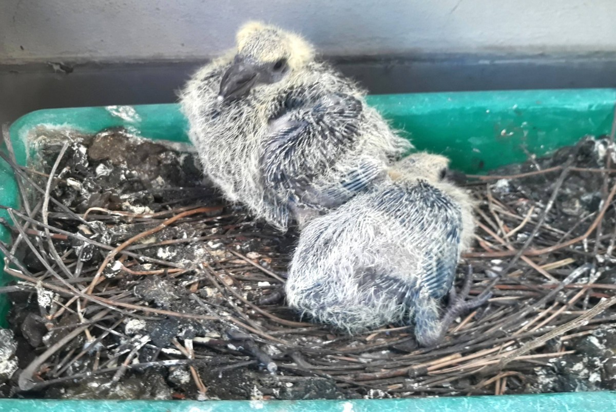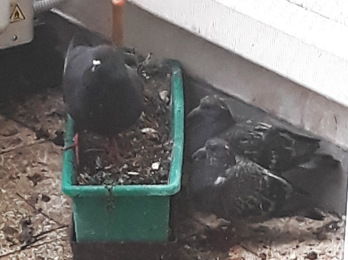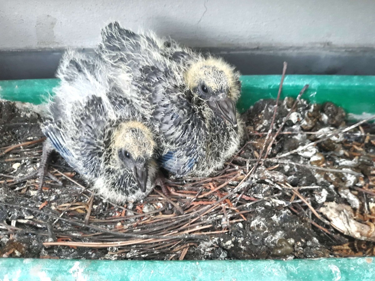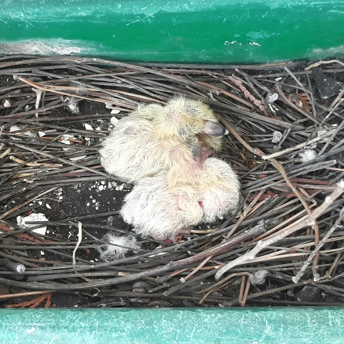 A dělo se… Holubi se v sezení na vejcích pravidelně střídali, ať byla zima a mráz nebo ne. Podařilo se mně nafotit holubici, jak přilétla na parapet a opatrně šla k truhlíku usadit se na vejce (obr. 2 až 7). Holub byl plašan a můj sebemenší pohyb u stolu ho vždy odradil a odlétl. Pak jsem byl týden na zájezdu, tedy mimo byt, a tak jsem požádal dceru, aby dohlížela na vývoj a podávala hlášení. Ona našla někde zbytek zrní pro papoušky, které kdysi chovala, a sedícím holubům ho trochu přisypávala. Do dvou dnů po návratu ze zájezdu koukám a v truhlíku vidím dvě malé žluté chlupaté kouličky. Hurá, stihl jsem to! Holoubátka se vylíhla zřejmě 25.3.2025 odpoledne (obr. 8). Výraznější na kouličkách byly akorát zobáčky. A tím odstartovalo sledování vývoje holoubátek, která většinu času pod sebou skrývala a krmila holubice či holub. Zejména plašan holub vždy čekal na parapetu terasy na vhodný čas na krmení, aby vystřídal sedící holubici (obr. 9). Dorozumívali se spolu specifickým vrkáním. Bylo neskutečné, jak byli dobře sehraní. Holoubci spolu rostli a rostli, přičemž jeden byl prokazatelně větší než druhý. Z roztomilých žlutých chlupatých kouliček se stávala rozčepýřená tmavnoucí holoubátka. Vývoj dokladují obrázky 10 až 14 (stáří 5, 9, 11 a 17 dní). Přitom již v této fázi bylo zřejmé, jak větší holoubě chrání to menší.