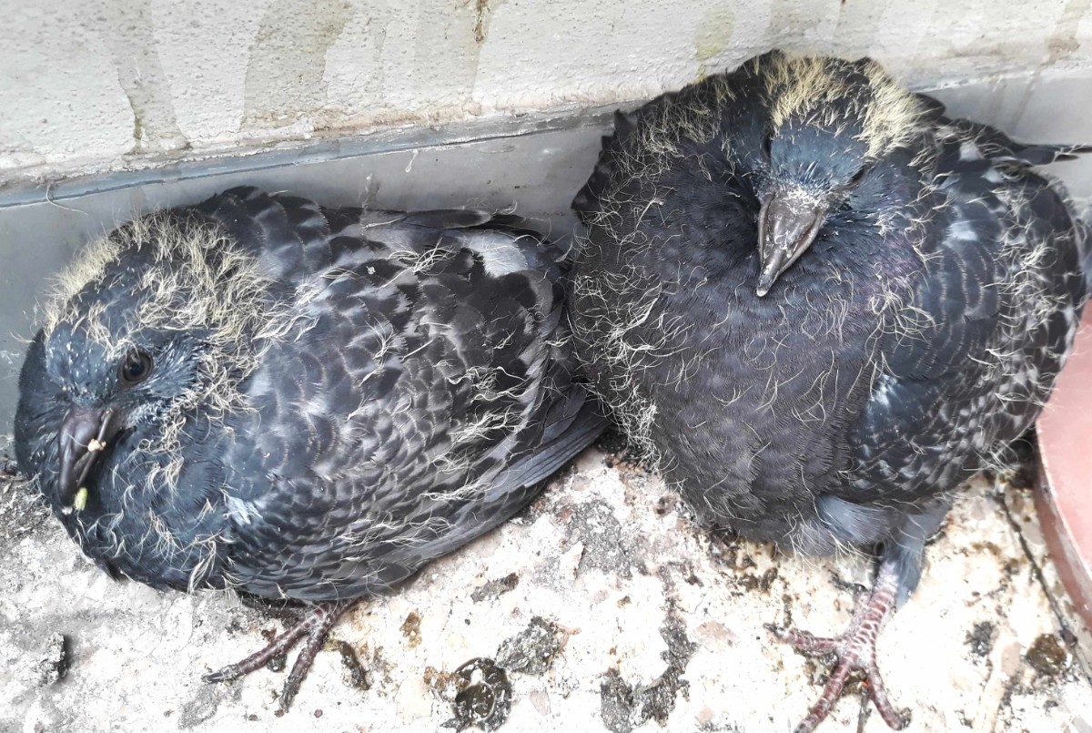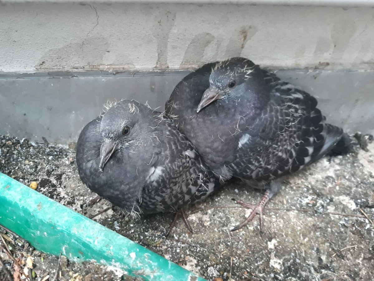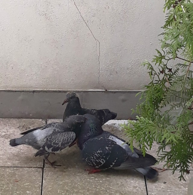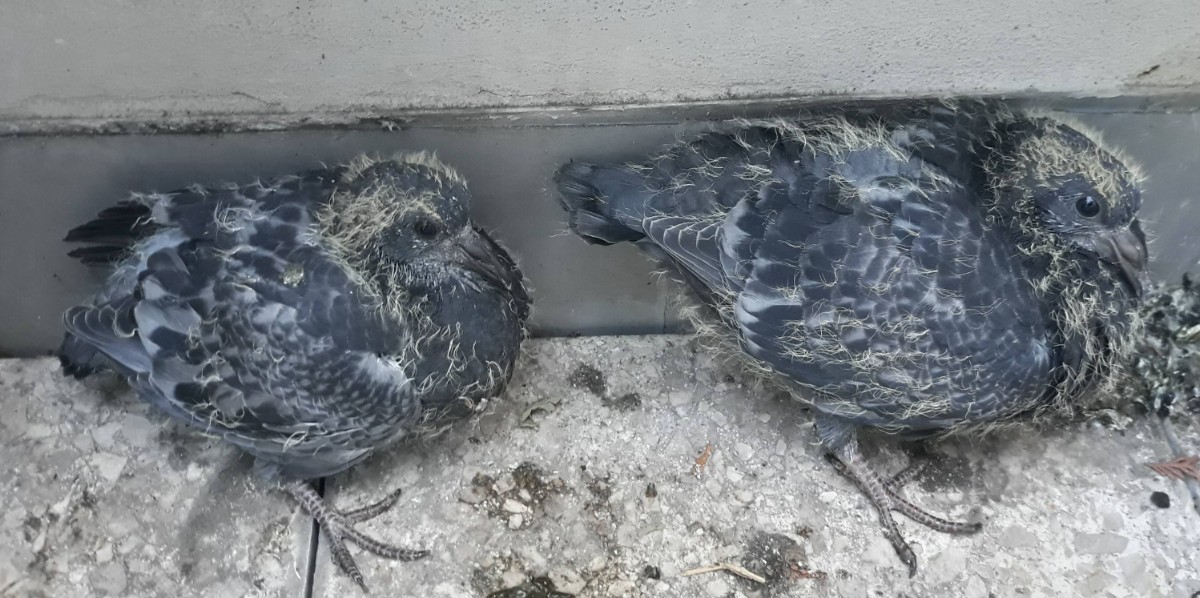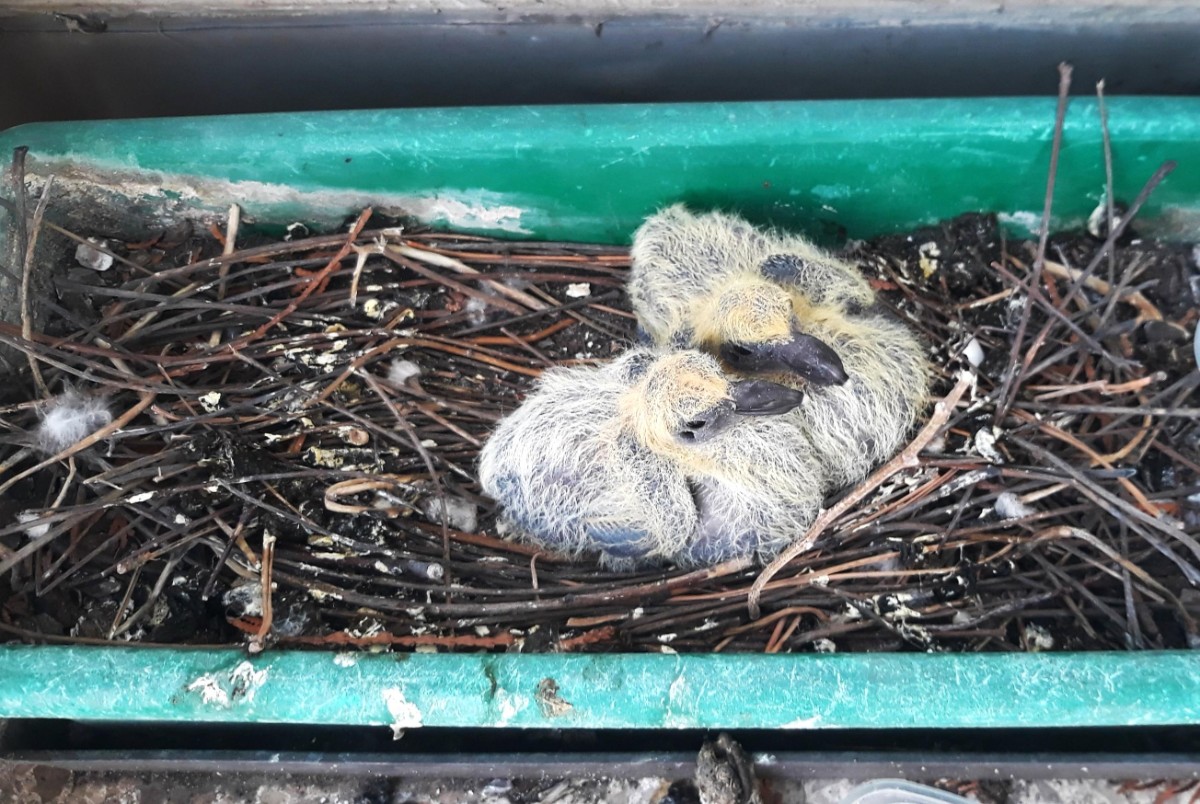 A dělo se… Holubi se v sezení na vejcích pravidelně střídali, ať byla zima a mráz nebo ne. Podařilo se mně nafotit holubici, jak přilétla na parapet a opatrně šla k truhlíku usadit se na vejce (obr. 2 až 7). Holub byl plašan a můj sebemenší pohyb u stolu ho vždy odradil a odlétl. Pak jsem byl týden na zájezdu, tedy mimo byt, a tak jsem požádal dceru, aby dohlížela na vývoj a podávala hlášení. Ona našla někde zbytek zrní pro papoušky, které kdysi chovala, a sedícím holubům ho trochu přisypávala. Do dvou dnů po návratu ze zájezdu koukám a v truhlíku vidím dvě malé žluté chlupaté kouličky. Hurá, stihl jsem to! Holoubátka se vylíhla zřejmě 25.3.2025 odpoledne (obr. 8). Výraznější na kouličkách byly akorát zobáčky. A tím odstartovalo sledování vývoje holoubátek, která většinu času pod sebou skrývala a krmila holubice či holub. Zejména plašan holub vždy čekal na parapetu terasy na vhodný čas na krmení, aby vystřídal sedící holubici (obr. 9). Dorozumívali se spolu specifickým vrkáním. Bylo neskutečné, jak byli dobře sehraní. Holoubci spolu rostli a rostli, přičemž jeden byl prokazatelně větší než druhý. Z roztomilých žlutých chlupatých kouliček se stávala rozčepýřená tmavnoucí holoubátka. Vývoj dokladují obrázky 10 až 14 (stáří 5, 9, 11 a 17 dní). Přitom již v této fázi bylo zřejmé, jak větší holoubě chrání to menší.