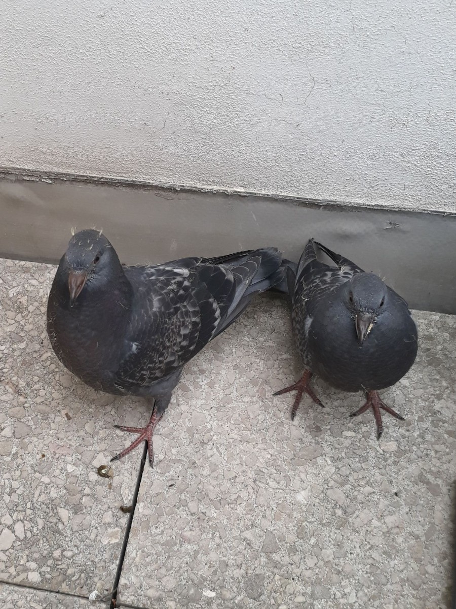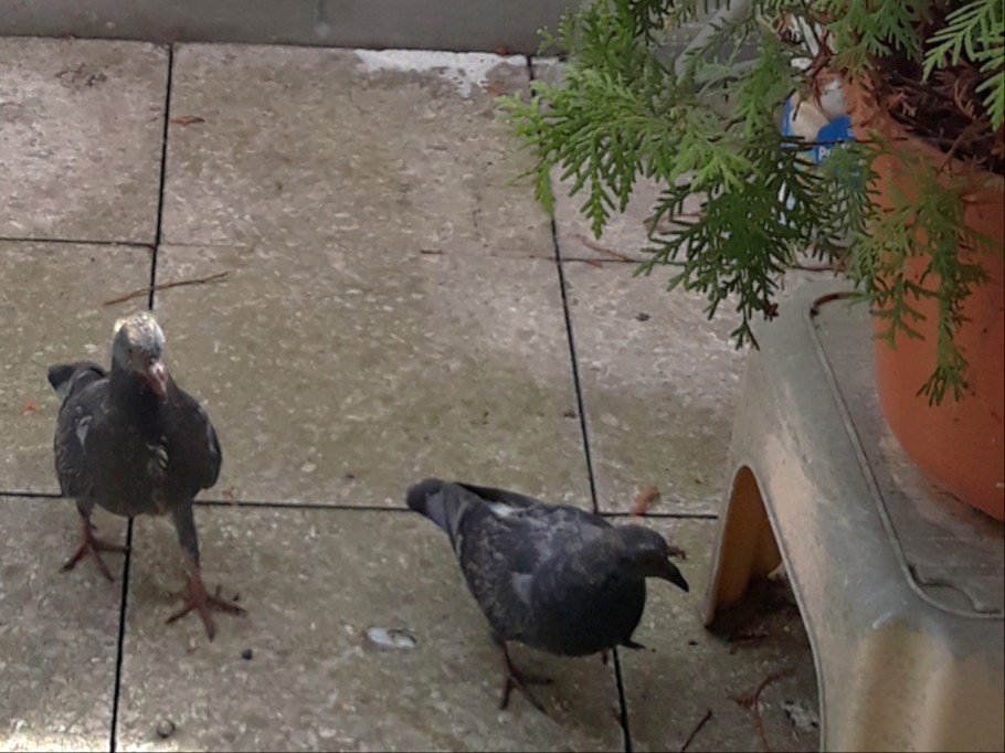 První pokus holoubat vylézt mimo truhlík se objevil po 18 dnech od vylíhnutí, tj. 12.4.2025, a po dvou dalších dnech už seděla holoubata mimo truhlík setrvale (obr. 15 až 17). Rodiče je létali střídavě krmit do zobáčků a holub povětšinou situaci monitoroval z parapetu (obr. 18). Pokud jsem seděl za stolem, na parapetu vždy vyčkávali, až se nebudu hýbat. Focení tedy začalo být složitější. Pozorování krmení bylo s postupem času stále zábavnější. Holoubátka za rodiči bystře utíkala po terase, aby o nic z krmení nepřišla. A přitom hlasitě pištěla (obr. 19 a 20). Dokonce se mně podařilo natočit na mobil krmení formou videa ve formátu MP4, které ale do článku přes youtube nahrát neumím... Škoda!