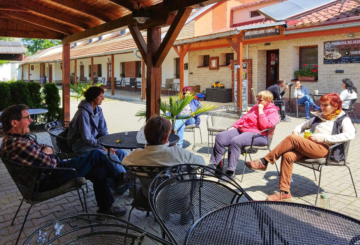 A už jste se mnou na náměstí v Lednici, kde jsme potkaly v cukrárně bandu našich holek. Dortík a kafčo nás nastartovalo na závěrečnou cestu. Využily jsme možnost přepravy s kufry autem. Po zavolání Marušce se po chvilce objevil Jirka a Zbyněk a dovezli nás do Penzionu Hippoclub. Původní třílůžkový pokoj jsme uvolnily Helče a Dimkovi, přihlásili se pozdě, potřebovali být v přízemí a nikde jinde místo nebylo. Majitelka nám nabídla ubytování v apartmánu A2 v prvním patře a zároveň k nám přidala Květinku, která neměla s kým bydlet. My ji rády přijaly a spala se mnou v pokoji. Apartmán je mimo hlavní budovu, krásný, útulný, 2 pokoje, obývací prostor s kuchyňkou a krbová kamna.