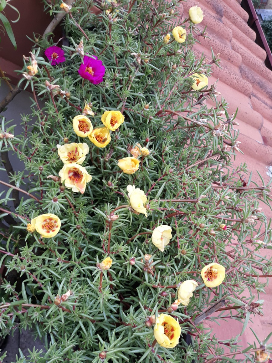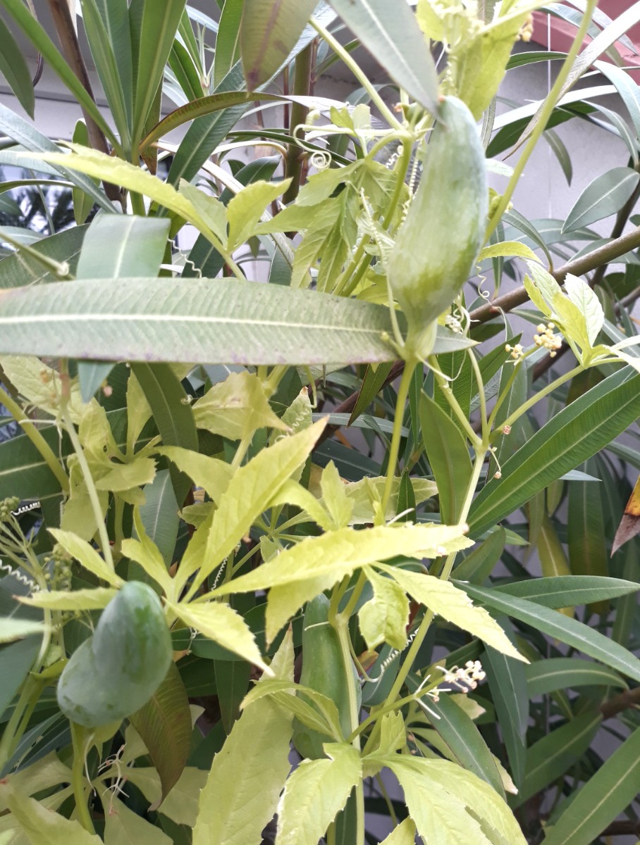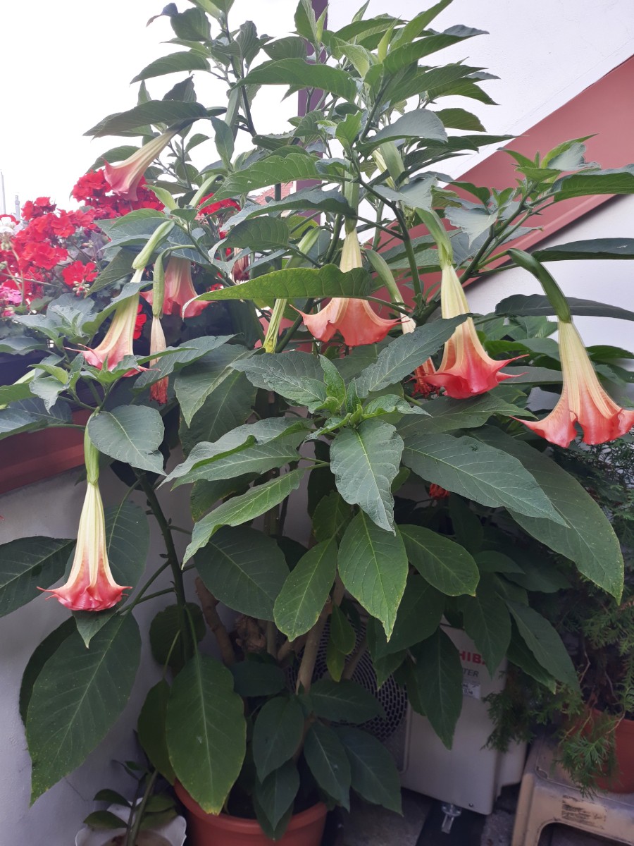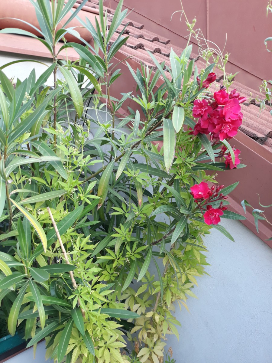 Aktuální celkový pohled na rozkvetlou terasu je na úvodní fotografii k článku. Za článkem následují vyfocené bohatě kvetoucí muškáty, šrůchy, karmínový květ oleandru, který je propletený plazivou ačokčou nazývanou papriková okurka, vypěstovanou z loňských semínek (https://cs.wikipedia.org/wiki/Ačokča), která už má plody (na následující fotografii), dále rovněž bohatě kvetoucí begónie korálová, kvetoucí růže a afrikány, sukulenty a bromélie na parapetu (avšak bromélie mně již druhým rokem nechce rozkvést) a nakonec durman, andělská trumpeta s velkými výraznými květy v lososové barvě. Durman nesnáší nižší teploty, a tak se musí na zimu přenést do místnosti. Přestože ho vždycky ořežu „až na dřeň“, od poloviny května začne rychle růst, až 1 cm denně, a v teplých letních dnech nasazuje a stále obnovuje nové květy.