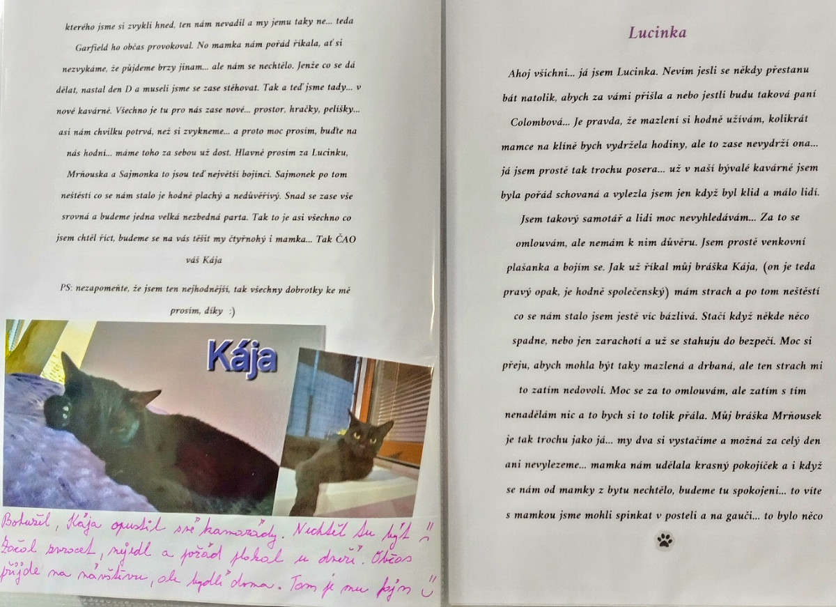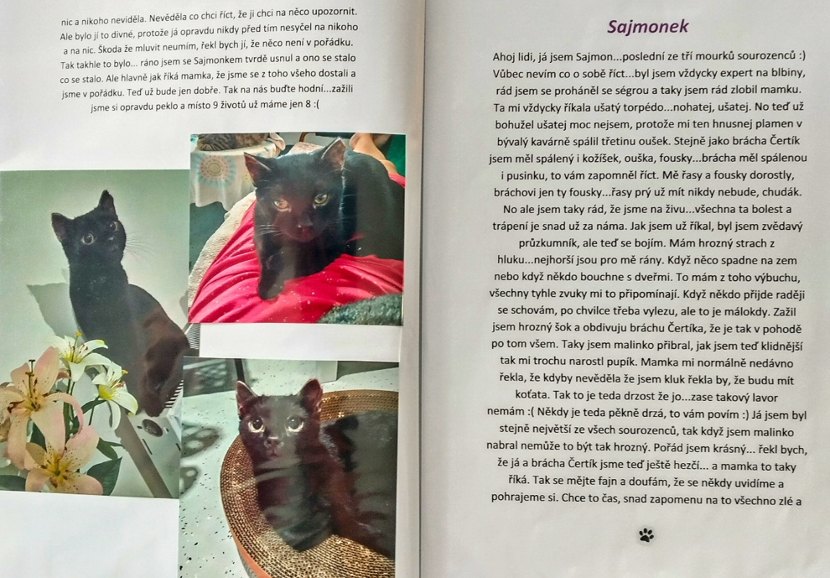 „Vtom mi volá kamarádka, že mám v kavárně vysklená okna. První, co mne napadlo, že je nějací vandalové vytloukli. Jenže kamarádka pokračovala: ,Dělej, šlehají tam plameny.´ Nasedly jsme s mamkou do auta a řítily se ke kavárně. Na místě již byli hasiči, o kočkách nikdo nic nevěděl. Nepochybovala jsem, že přežily, ale schovaly se. Přesvědčila jsem velitele zásahu, dostala přilbu a šli jsme je hledat. Byly různě poschovávané po místnosti. Všechny přežily. Vyděšené, popálené …,“ má paní Lucie slzy v očích.