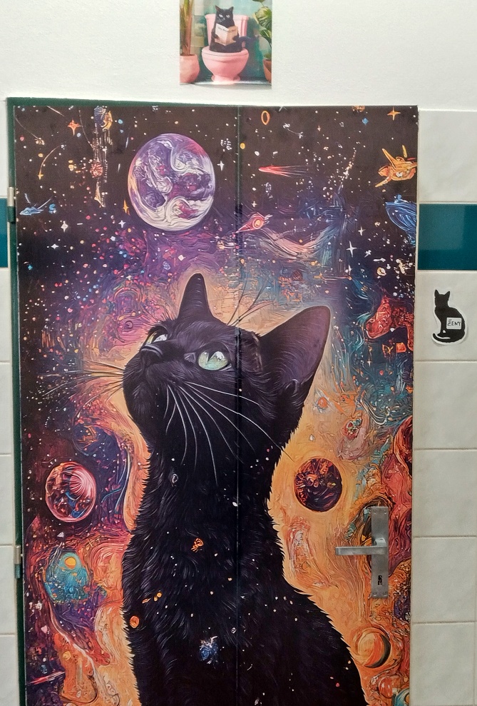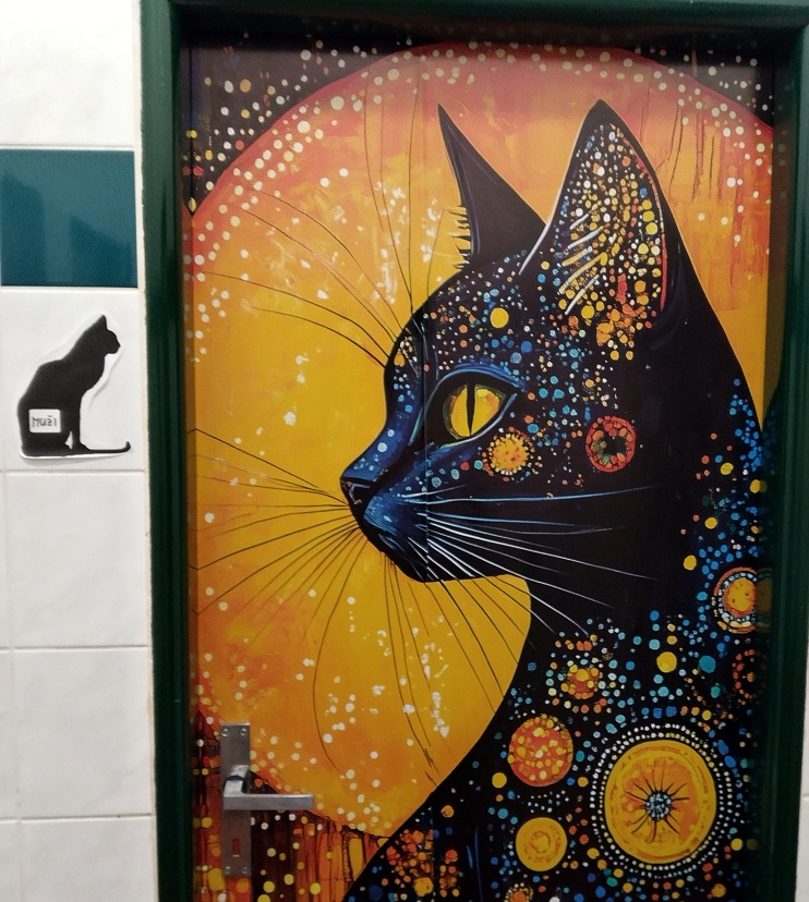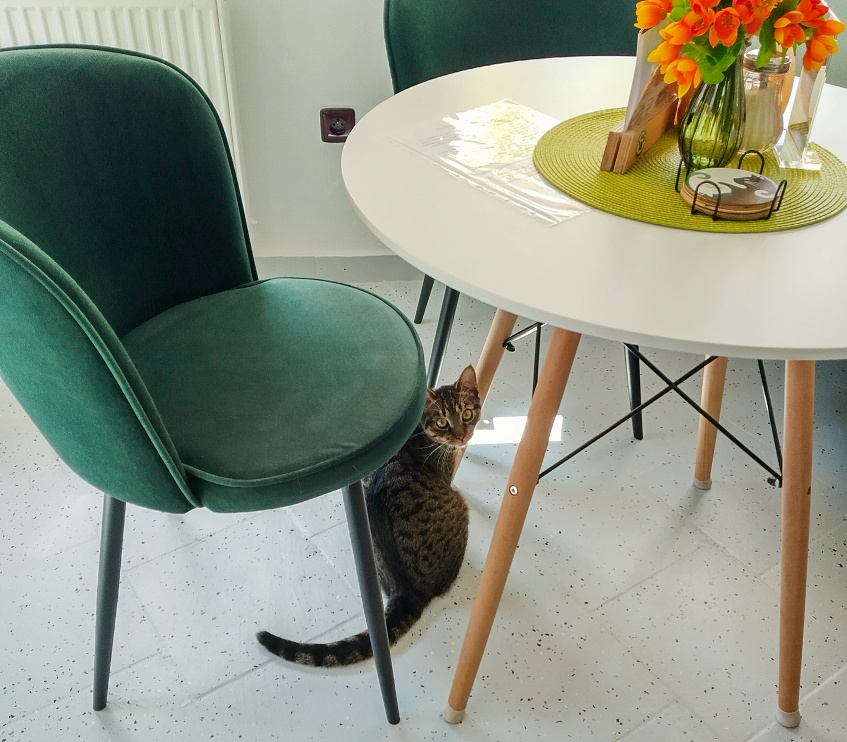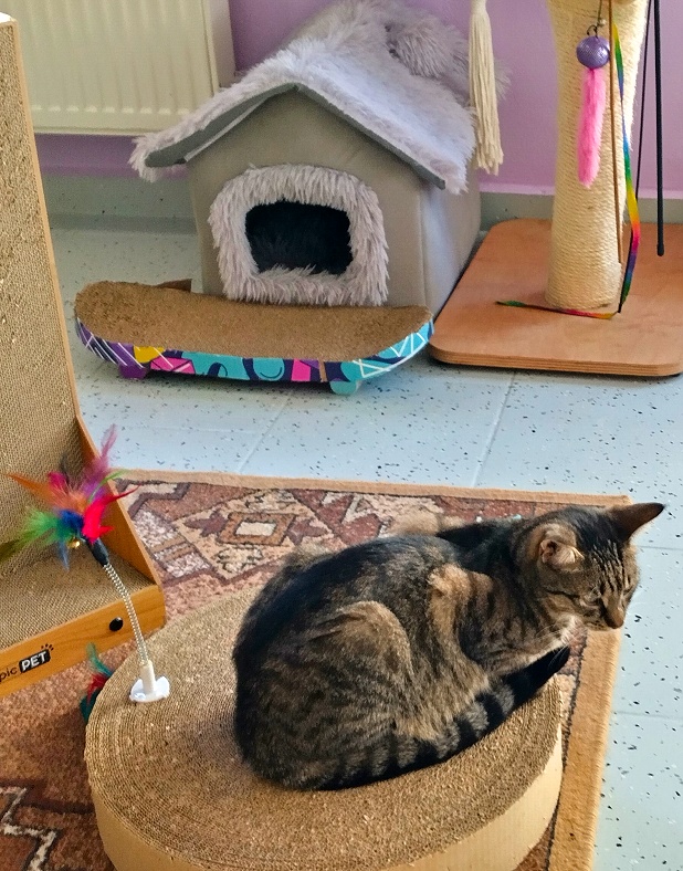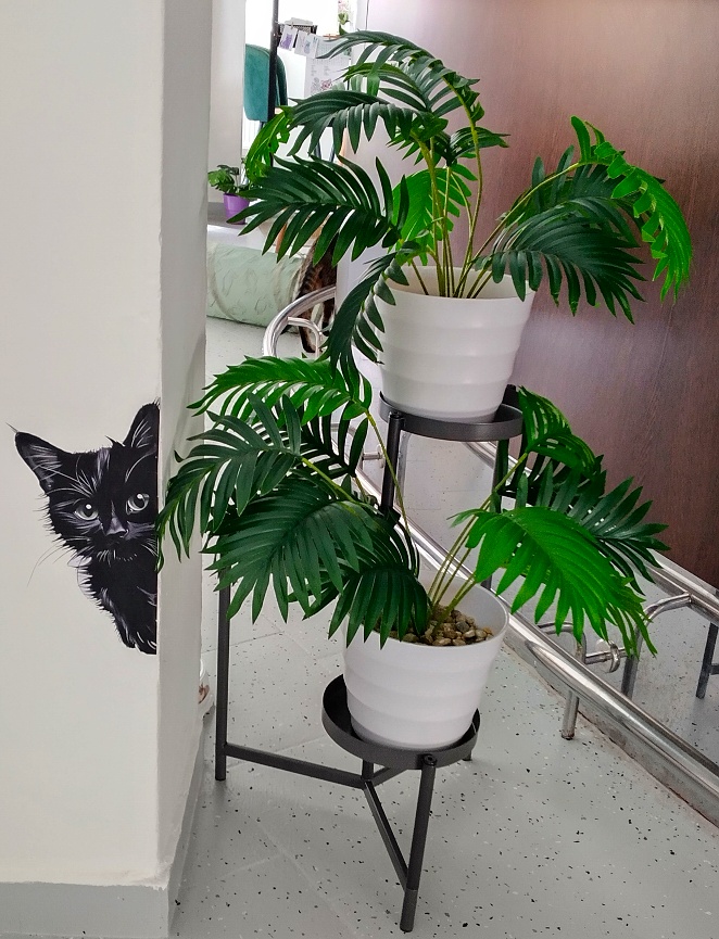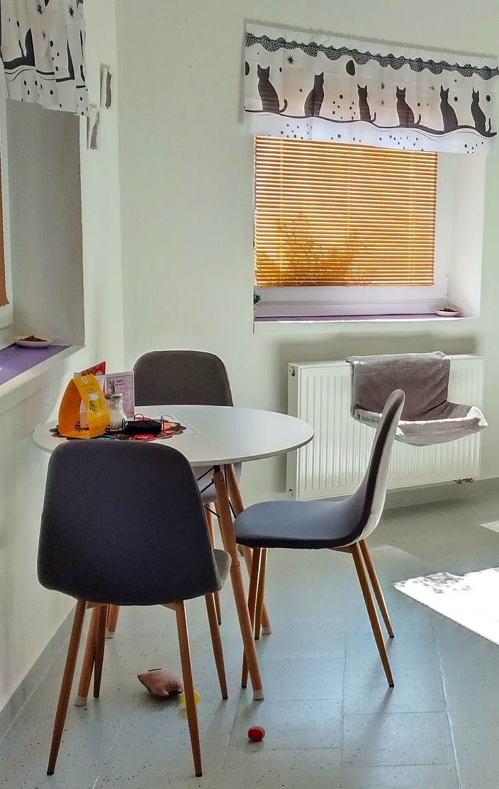 Seznamuji se s milou a sympatickou majitelkou kavárny, představuje mi jednotlivé obyvatele a obyvatelky. Procházím se po velké elipsové vybílené místnosti, vyzdobené obrázky, poličkami, samolepicími tapetami a dalšími dekoracemi s kočičí tématikou, fotografuji a nasávám atmosféru. Všude se line libá vůně, sluníčko příjemně prosvětluje žaluzie. Kromě pohodlných křesílek, židliček či pohovek jsou po celé kavárně včetně stěn rovnoměrně rozmístěná škrabadla, pelíšky, hračky, houpačky, prolézačky, misky s krmením a vodou a další kočičí propriety.