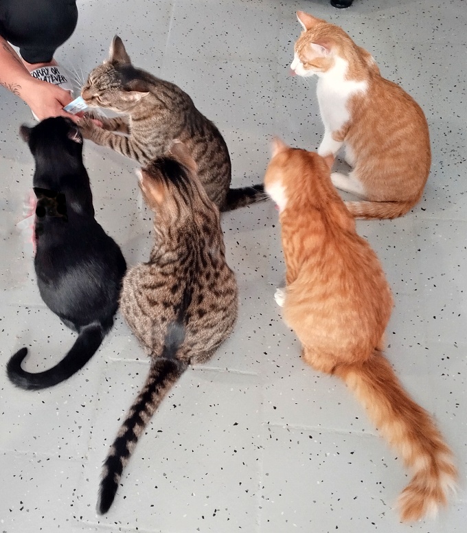 Kočky se běžně pohybují mezi návštěvníky kavárny, v zázemí však mají i svůj soukromý pokojíček s pelíšky a toaletami.