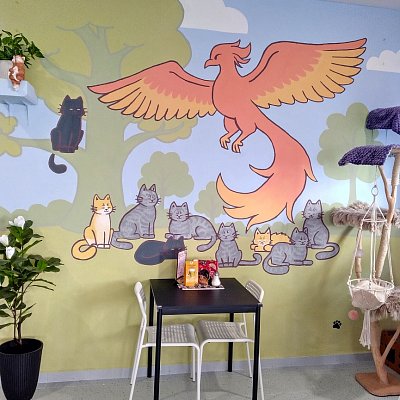 Malbu bájného ptáka Fénixe se zachráněnými kočičkami vytvořila na stěně kavárny kamarádka majitelky