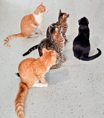 S poděkováním se připojují i kočičky - zleva vzadu Garfield, Terezka, Sajmonek a Čertík, vpředu nový Fénix. Lucinka, Čiko a Mrňousek spali v pelíšcích a ve svém pokojíčku