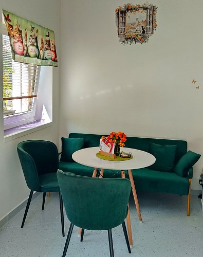 Křesla i pohovky jsou čisté bez kočičí srsti, stoly se skví čistotou. Chladící boxy nabízejí nealko nápoje, obložené chlebíčky, zákusky, jablečný závin. Podle slov paní Plíhalové vše domácí výroby. Do nabídky patří i víno, pivo, káva, čaj, hlad zaženete lákavě vypadající pizzou či toasty s různými náplněmi.