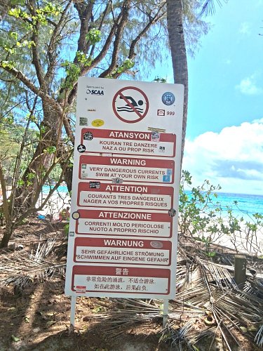 Názvy většiny pláží na Mahé začínají slovem "anse", což ve francouzštině znamená "malá mělká zátoka". Vedle pláže vidíme luxusní rezidence miliardářů z celého světa, diskrétně skryté v bujné tropické vegetaci. Je tam rovněž stejně luxusní hotel. Některé hotely na Seychelách mohou být podle našeho hostitele Roddyho neskutečně drahé. Pokoj v nich stojí sedm tisíc euro za noc nebo dokonce až dvacet tisíc euro za noc. Raději se věnujeme nenápadnému informačnímu panelu. V několika jazycích je tam uvedeno varování před nebezpečnými mořskými proudy. Na prvním místě je kreolština, jazyk místních obyvatel.