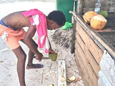 Ještě předtím jsme byli česky osloveni nepříliš sympatickým místním mladíkem, který nám nabídl kokosové ořechy, lépe řečeno nápoj z nich. Proč ne? Mačetou umně otevřel plody kokosové palmy, jejichž mléko (nebo spíše vodu) jsme s chutí vypili.