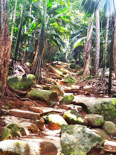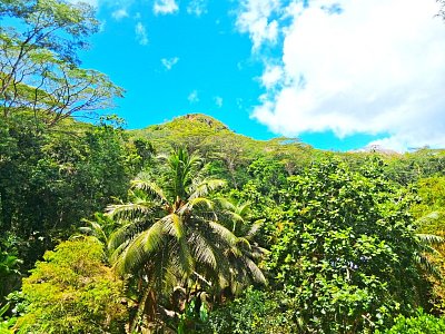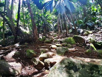 Stezka směřující do kopce vede do deštného pralesa. Jsme rádi, že máme možnost vidět, jak Seychely vypadaly před příchodem francouzských osadníků kolem roku 1770.