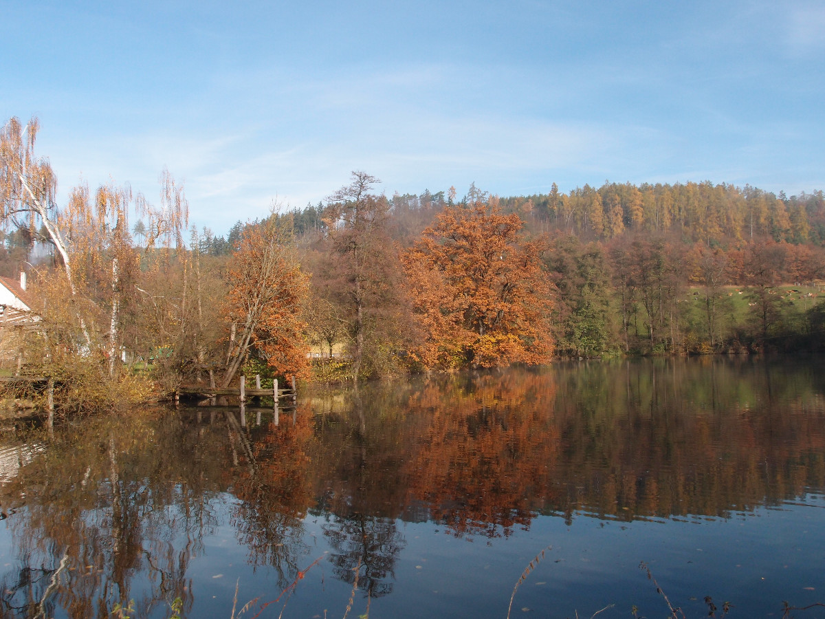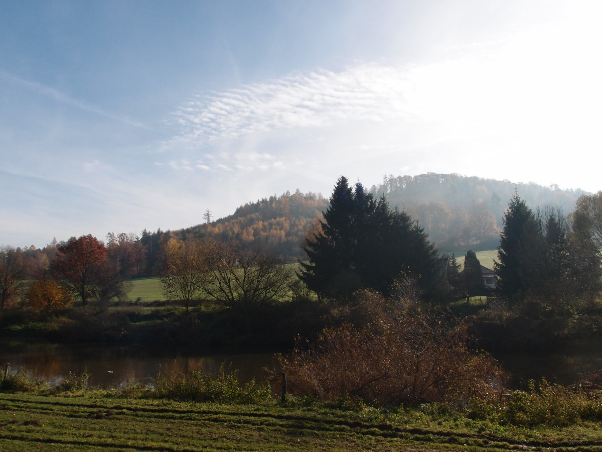 Šli jsme dál a dál podle řeky, když se najednou slunce konečně prodralo ven a krajina se rozzářila. Řeka se třpytila jako stříbro, jinovatka se měnila v kapky rosy a tráva se střídala s bílou a sytou zelení. Před chatami byly uvázané rybářské loďky a vrby se skláněly až k vodě. Ve vodě se zrcadlily odlesky stromů a chat. To bylo něco! To bylo pokoukáníčko! To byla nádhera! Zhluboka nadechnout, přivřít oči a cítili jste ten chladný ostrý vzduch, jak vám proniká do celého těla. Tak vypadalo podzimní ráno u řeky Sázavy.
