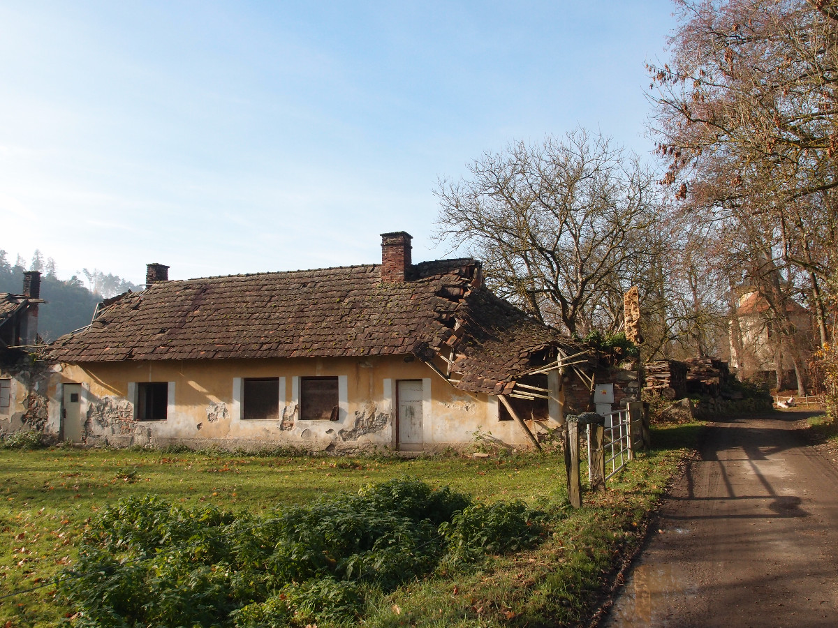 Šli jsme po silnici, chvílemi po chodníku, podél tichého toku, až jsme došli ke Zbořenému Kostelci. Tam jsme znovu překročili řeku – a rázem jsme se ocitli v jiném světě. Po levé straně se zvedaly skály, nad nimi se rýsovala zřícenina hradu Zbořený Kostelec, a přestože se mlha pořád nechtěla vzdát, už se v ní, ale začínaly objevovat první sluneční paprsky.