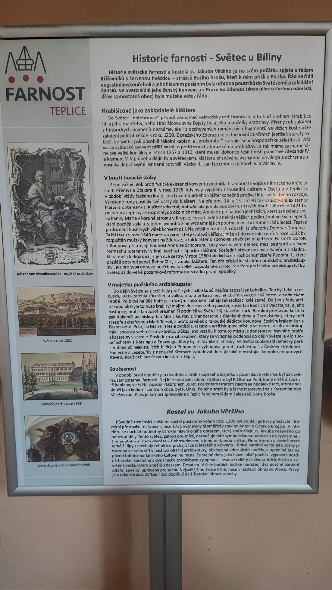 Tak jsem si dnes zašla na mši do našeho kostelíka sv.Jakuba Většího. Je to nejvýznamější kulturní památka ve Světci. Kostel vznikl koncem 12. století. Původní pozdně romanská bazilika se dvěma věžemi. Kolem roku 1467 historie zaznamenává pozdně gotickou úpravu,na kterou kostel čekal od skončení husitských válek. Následovala až barokní přestavba kostela, zahájena roku 1731. Autorem této barokní úpravy, byl významný litoměřický stavitel Octavio Broggio.