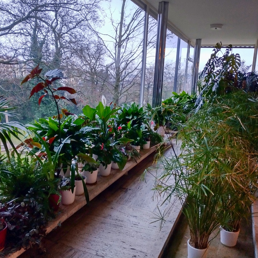Hlavní prosklenou stěnu před zimní zahradou je možno zatáhnout černým závěsem ze šantungového hedvábí navazujícího na černý sametový závěs mezi onyxovou příčkou a zimní zahradou. Naše skvělá a vtipná průvodkyně, troufám si přímo říci, že erudovaná (dle slovníku cizích slov = znalá, zkušená, vzdělaná), se právě chystá nám ukázat, jak vypadá onyxová stěna, když ji prosvětluje slunce.