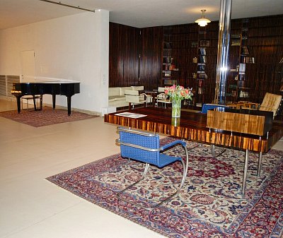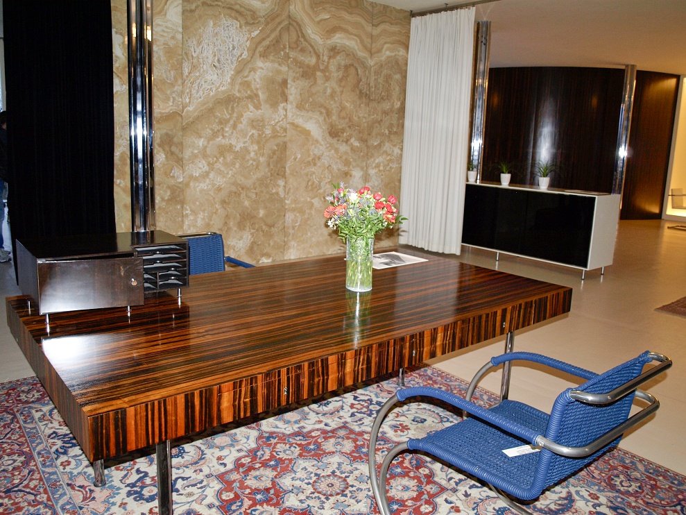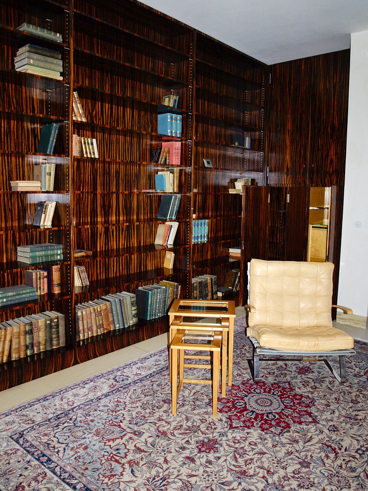 Nad klavírem (vlevo nahoře) se nachází okénko projektorové komory, z níž ve 30. letech Fritz Tugendhat promítal filmy, ale i své diapozitivy a amatérské záběry. Prostor za bufetem sloužil jako pracovna, které dominuje velký pracovní stůl s dýhou z makassarského ebenu, doplněný židlemi typu Stuttgart s područkami. Obytné prostory zdobí a osvětlují přesné repliky ikonické lustrů dánského architekta Poula Henningsena (1894 - 1967). Také vestavěná knihovna (v pozadí), jako jedna z mála v původním stavu, je obložena exotickou dýhou z makassarského ebenu, sahající od podlahy až ke stropu. Prohlédli jsme si bridžový stolek s posezením v barvě slonovinové kosti a volně stojící křeslo Tugendhat v béžové kůži s knoflíkovým štepem a područkami (v galerii). Křeslo Tugendhat bylo navržené Miesem v roce 1930 přímo pro brněnskou vilu a nese název podle majitelů. Také v knihovně je podlaha pokryta perskými koberci.