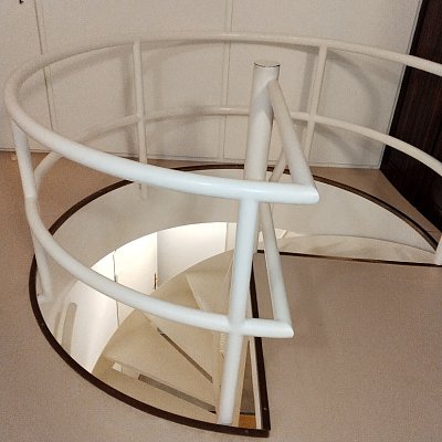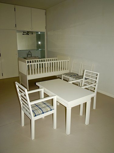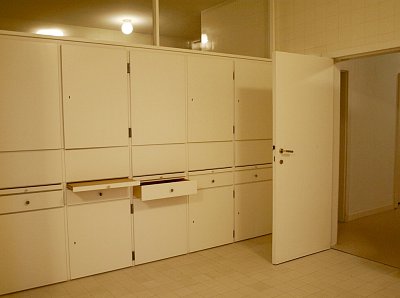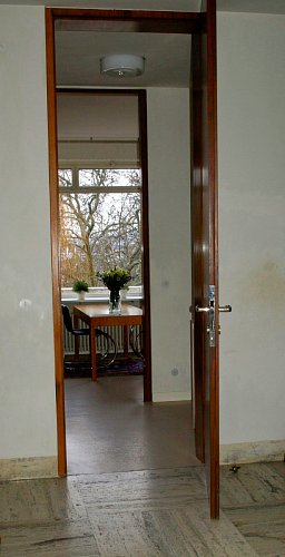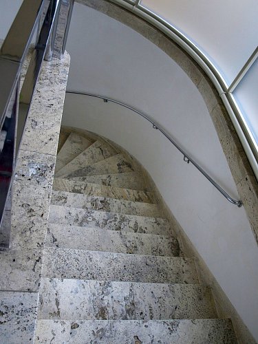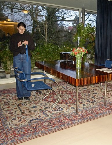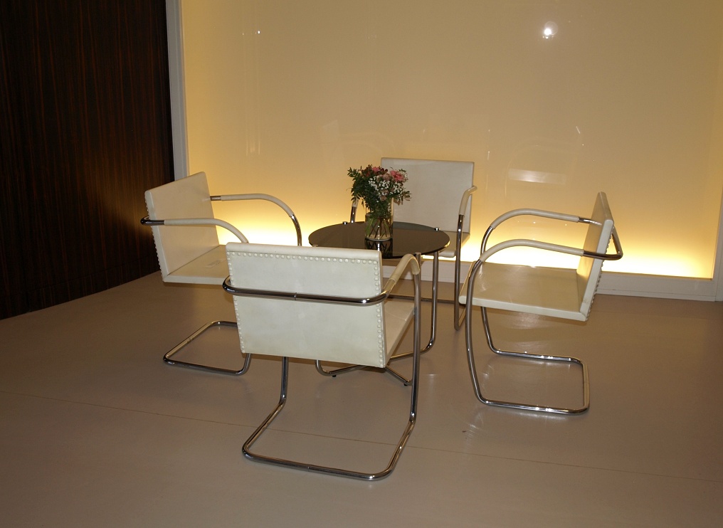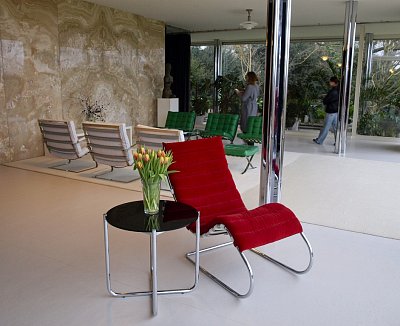 U stěny stojí kulatý stolek se dvěma křesly typu Stuttgart s područkami a ratanovým výpletem. Na podlaze a na schodišti (na snímku uprostřed pod mléčným sklem), kterým se sestupuje do hlavního obytného prostoru vily ve druhém nadzemním podlaží, byl použit italský travertin, pocházející z italského Tivoli, z oblasti Lazio. V tamních lomech se však již několik let travertin netěžil a Mies si proto nechal části lomu znovu otevřít. S ohledem na počasí a ochranu nákladných podlahových krytin jsme všichni získali na své obutí "slušivé" plastové návleky (přístroj, podobný vysavači, je ve fotogalerii).