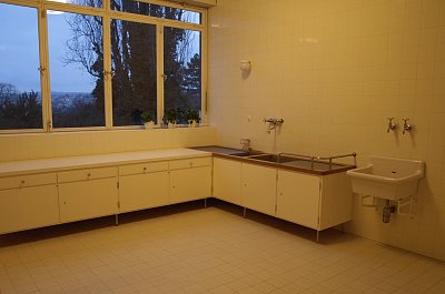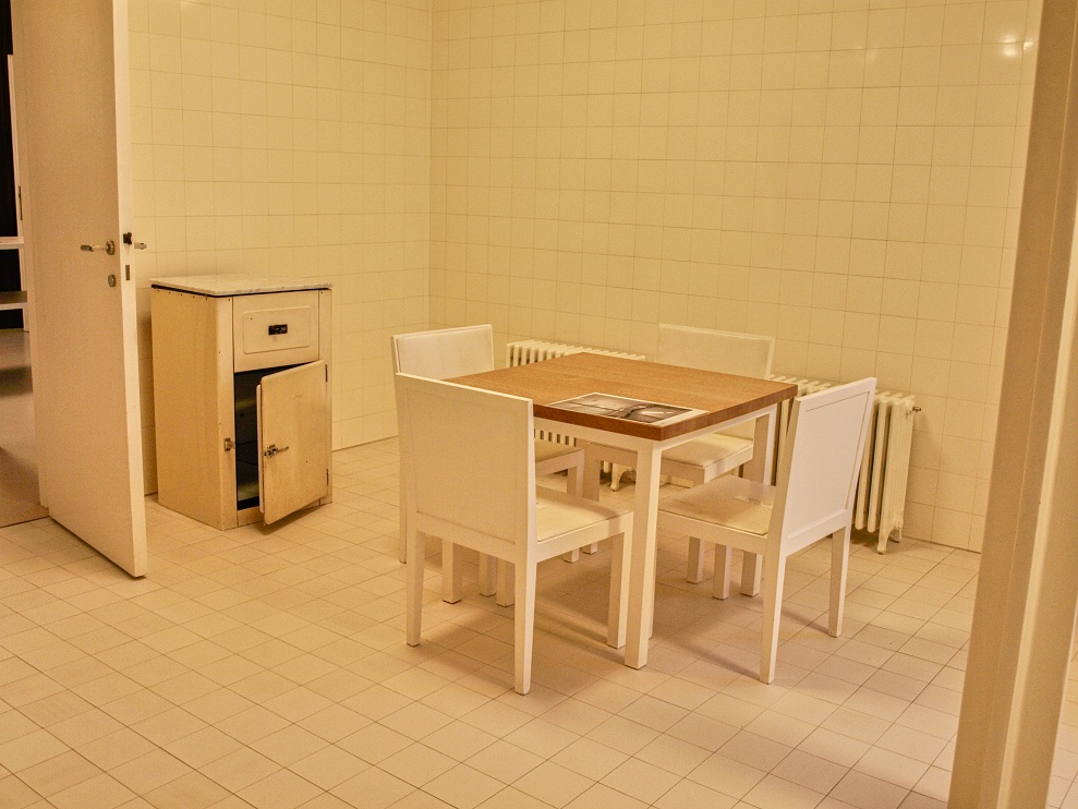 Naprosto nepochopitelné informace jsme šli "rozchodit" prohlídkou kuchyňského zázemí v personálním traktu. Uprostřed kuchyně (vlevo) býval zřejmě plynový sporák. Pod oknem a podél pravé stěny je „kuchyňská linka" s dřezem. V protějším koutě stojí dřevěný čtvercový kuchyňský stůl se čtyřmi dřevěnými židlemi s pergamenem (v galerii). Vestavěná dřevěná skříň odděluje spižírnu (vpravo). Stěny kuchyně jsou až ke stropu obloženy bělninovými obkladačkami barvy slonovinové kosti, na podlaze je položená keramická dlažba.