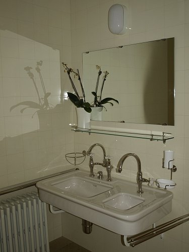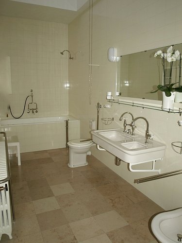 Z předsíňky mezi pokoji obou manželů je přístupná koupelna s WC. Paní průvodkyně nám s potutelným úsměvem zdůraznila, že na hygienu se v této rodině enormně dbalo.