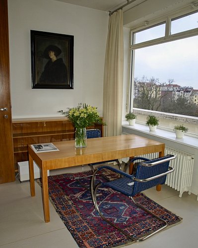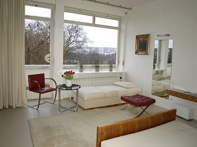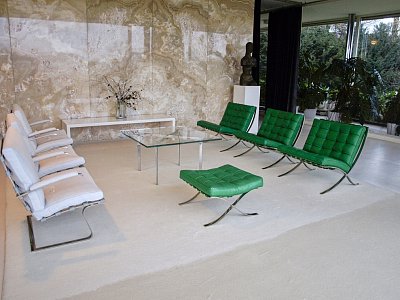 Podlahu před onyxovou příčkou pokrývá koberec ze světlé přírodní vlny, ručně tkaný Alen Müller-Hellwigovou v německém Lübecku. Stávající společenské posezení se skládá ze tří křesel a jednoho taburetu Barcelona ve smaragdově zelené kůži, tří křesel Tugendhat se stříbrošedým látkovým potahem a stolku. Křesla Tugendhat mají rám z ploché chromované oceli a výrazným prvkem jsou pryžové popruhy. Prohlíželi jsme si je i v pokoji vychovatelky  a v knihovně.