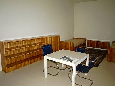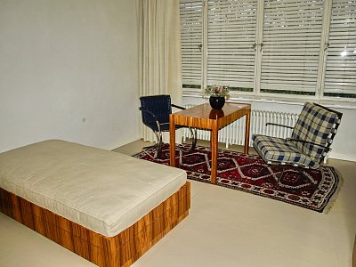 Budoár Grety Tugendhat kombinuje funkci ložnice a dámské šatny. Nalevo podél stěny jsou původní vestavěné skříně s palisandrovou dýhou, pod oknem stojí menší odpočinkové sofa. Nechybí zrcadlo s toaletním stolkem, před ním stolička Barcelona (Miesovou specialitou bylo pojmenování jednotlivých kusů nábytku). Židle s názvem Brno z pásové oceli s potahem z třešňově červené kůže a kulatý stolek z trubkové oceli byly Miesem navrženy přímo pro tuto vilu. Architekt ji hojně používal i ve svých pozdějších realizacích a židle se stala bezesporu jednou z nejproslulejších ikon světového designu 20. století. U vestavěné skříňové stěny jsou dveře, kterými paní Greta procházela přes malou předsíňku u terasy přímo do pokoje chlapců. Podlahu zdobí koberec z bílé ovčí vlny s vysokým vlasem. Nádherný, měkoučký, ale s ohledem na svůj vztah k domácím pracím bych ho doma nechtěla ... ;-)