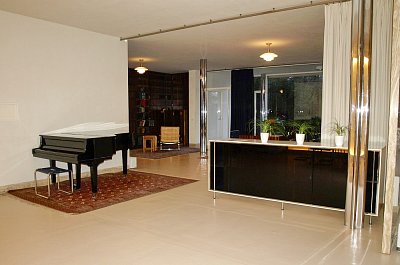 Bezprostředně vedle vstupu ze schodiště najdeme menší posezení sestávající ze čtyř židlí typu Brno potažených pergamenem v barvě slonovinové kosti  a kulatého stolku neprůhledné prosklené stěny, kterou lze shora či zdola podsvítit (v galerii). Plynule navazuje hudební "salon" s klavírem, stoličkou Stuttgart a bufetem z opaxitového skla, stojícím u onyxové příčky (vpravo za nosným sloupem). Variabilního propojení a uzavření tohoto obrovského obytného prostoru prostoru docílil architekt Ludwig Mies van der Rohe užitím několika závěsů ze šantungového hedvábí a bílého sametu. Právě cit pro materiály a barevnost a jejich nevšední využití v interiéru byly doménou berlínské návrhářky Lilly Reich, která s Miesem na návrhu interiéru úzce spolupracovala.