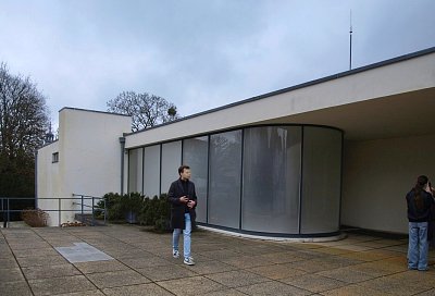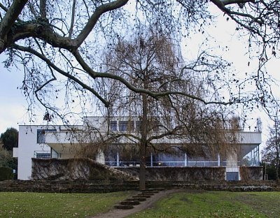 Přicházejíce ze společné zahrady vil Löw-Beer a Tugendhat, obdivovali jsme geniální zasazení třípodlažní stavby do svažitého terénu. Obytné prostory jsou orientovány na jihozápad, tedy do zahrady, odkud přicházíme. Dle průčelí z Černopolní ulice totiž vila vypadá pouze jako jednopatrová.Výškový rozdíl vyplňuje poměrně rozsáhlý dilatační prostor (tzv. tunel) na úrovni druhého nadzemního podlaží. Zastavěná plocha celého domu činí 907 m², plocha hlavního obytného prostoru 237 m². Na chvíli jsem zalitovala, že není jaro. Fasády domu, porostlé popínavou zelení, dokáží "zamaskovat" jeho zmizení v zeleni, čímž umocní dokonalé propojení interiéru s exteriérem. Kromě terasy je nejkrásnější pohled do zahrady z jídelny a hlavního obytného prostoru přímo proti smuteční vrbě (na snímku uprostřed, vlevo schodiště, vedoucí z terasy do zahrady).