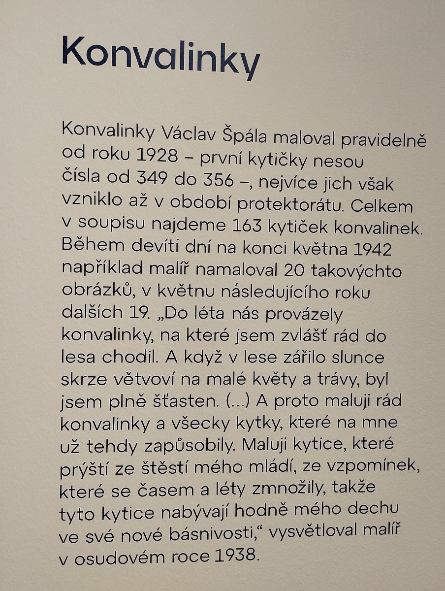 Na doprovodných textech si můžeme přečíst zajímavé informace z jeho života. Dozvíme se i o malířově soupisu obrazů. Ty si nejen čísloval a zapisoval data jejich vzniku, ale i sám pro sebe svá díla hodnotil známkou I až III. Třetí stupeň bylo nejvyšší hodnocení tzv. prima vzácné. Vzácně takto ohodnotil jen 29 obrazů. Výjimečně, jen třem kyticím udělil i čtvrtý stupeň, tzv. primissima. U každého vystaveného obrazu si lze na popisce přečíst tyto údaje. Některé své běžné obrazy Václav Špála nebodoval.