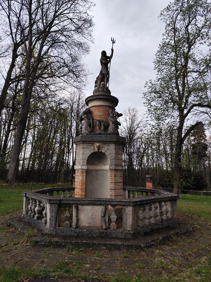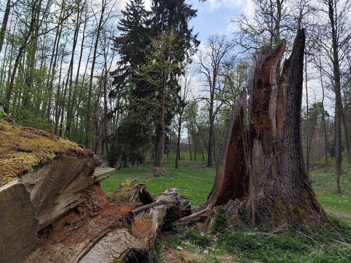 Mezi zámkem a sousedním městem je obrovský areál. Říkají tomu park, to si ale musím zakrýt uši, protože třeba i anglický park je pečlivě pěstěný a jen zdánlivě vypadá jako romantický nepořádek. Tady ale správci s přírodou docela bojují. Možná proto, že celých 340 hektarů nemá na starosti jediný. Něco v „parku“ vlastní město, něco Lesy ČR, něco Národní památkový ústav. Celkově se mi zdálo, že mnoho stromů není ošetřovaných ani kácených a podle mého laického názoru celá vegetace správcům „přerostla přes hlavu“. Opuštěný strom na snímku dole však nijak nehaním, ježto jde o důležité sídliště pro saproxylický hmyz (taky jsem musel na internetu zjistit, co to znamená).