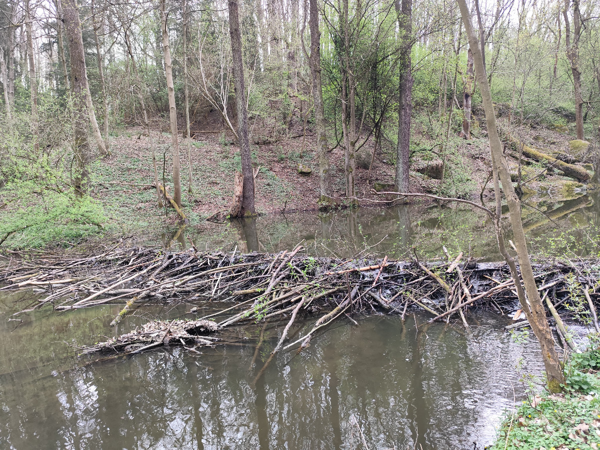 Na potoku několik kilometrů pod zámkem jsem našel pečlivě vytvořenou bobří hráz (viz fotka). Potok teče malebným údolím, škoda, že z jedné strany začíná rozsáhlá obora či bažantnice. Za války patřil jak zámek, tak široké okolí německým SS, kteří tu měli velitelství i výcvikový prostor. Aby si zpestřili konec války, popravili ještě na konci dubna 1945 devět amerických letců, jejichž B17 se podařilo sestřelit. Mluví o tom pomníček poblíž potoka hned pod zámkem.