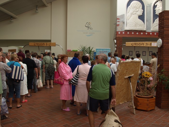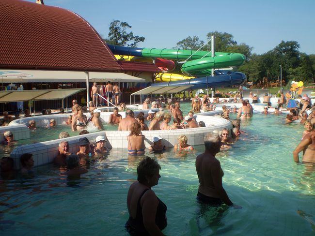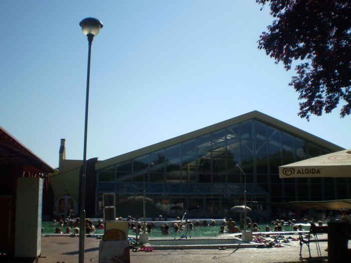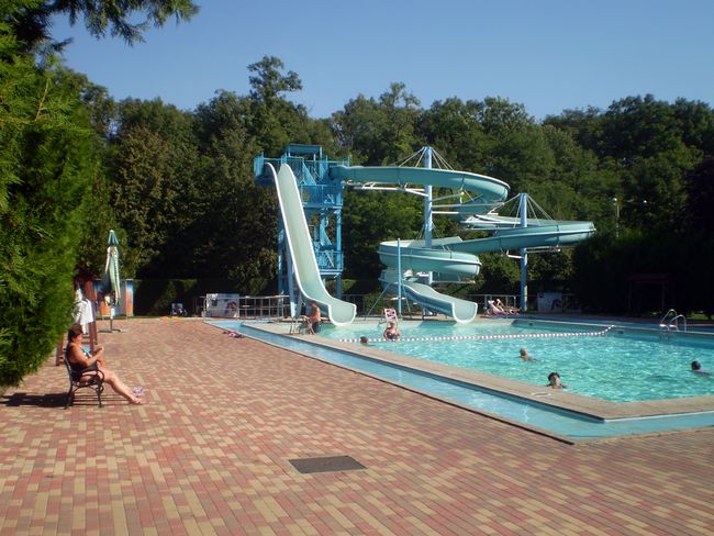 Jeli jsme do Veľkého Mederu  poprvé na doporučení přátel, kteří tam z Čech jezdí nejen na dovolenou, ale relaxovat i na víkendy. Ubytování za 7,5 euro za osobu a noc. To je v přepočtu přibližně jen 187 Kč. V září bylo krásné slunečné babí léto a ceny v lázeňském městečku po prázdninách klesají. Chápu, že ne každý si může ušetřit na podobnou rekreaci  z důchodu, ale přál bych to všem, kteří mají o relativně levný pobyt zájem. Ke vstupu do lázní dostanete elektronický náramek s čipem, který vám umožní zamknout skříňku v lázních a případně platit i v restauracích uvnitř areálu. Navíc během dne můžete z lázní odejít na oběd a po čase se můžete vrátit zpět. Podrobnější informace na webové stránce www.corvinus.sk  Ano to jméno odpovídá jménu maďarského krále  Matyáše Korvína, na jehož připomínku narazíte ve městě často. Když si najdete na internetu informace o městě Velký Meder, tak zjistíte, že má téměř 9000 obyvatel a bývalý starosta města je ve vězení na 32 měsíců za korupci. Zdá se, že korupce prorůstá všude.  Viz zde. Ve městě je 84 procent obyvatel maďarské národnosti a po II.světové válce byla řada rodin odsunuta – podobně jako některé německé rodiny v Čechách. Všude najdete dvojjazyčné nápisy v maďarštině a slovenštině. Veľký Meder se jmenuje maďarsky Nagymegyer.